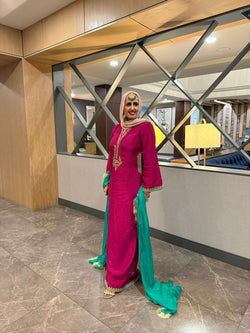 Full length shirt paired with ajar pants and silk dopata detailed with gold marori and mirror work on neckline sleeves pants bottom and shirt side pockets
