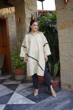 Exquisite linen kurta with ruched collars and intricate detailing. Breathable and