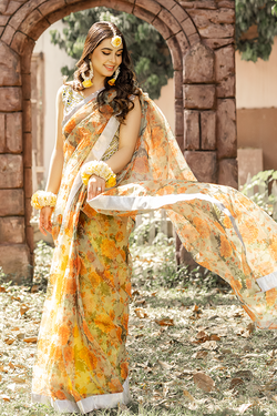 Keeping in the mind, the exclusive seasonal trends, Chambeli is a colorfully floral draped saree on the base of organza and pure silk blouse crafted masterfully with mirror and gota embellishments stitched on the canvas of yellow hue making it a wholesome treat for your forthcoming festivities.