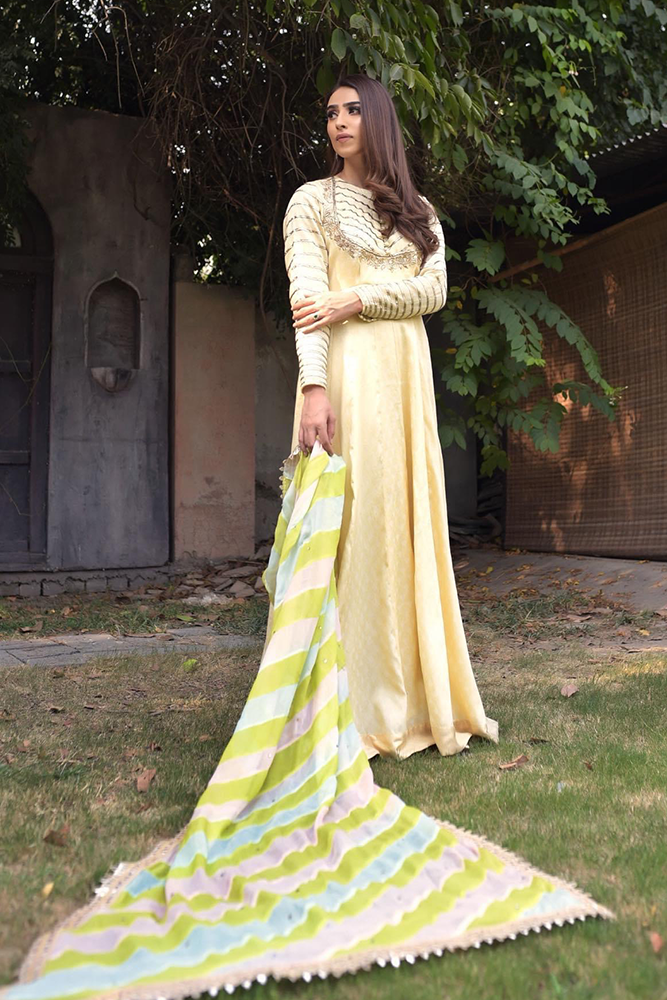 Embossed cotton pishwas with gota ari work on neckline and sleeves paired with chatapatti dupatta.