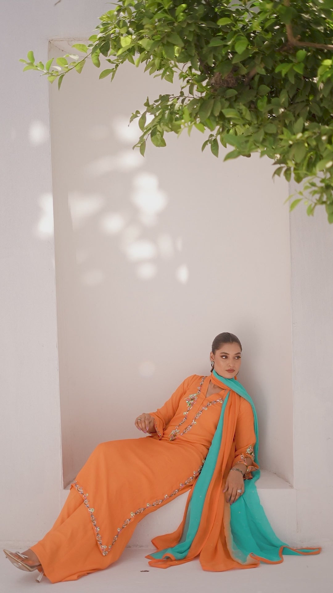 This elegant ensemble features a finely tailored shirt adorned with intricate embellishments. The neckline is gracefully decorated with delicate sequin and beadwork, adding a subtle shimmer that catches the light beautifully. The sides and hemline of the shirt are similarly embellished, enhancing the silhouette with an opulent yet refined touch. The sleeves, extending to full length, are also finished with matching bead and sequin detailing, lending cohesion and balance to the overall design. The shirt is paired with long, flowy ajar pants, which offer a sense of grace and movement. To complete the look, the outfit includes a stunning double-tone dupatta in shades of orange and turquoise. The vibrant contrast between the warm and cool tones creates a visual harmony that ties the ensemble together. The dupatta may be crafted in a lightweight, sheer fabric like chiffon or organza, allowing the colors to blend softly and enhancing the dress's feminine charm.