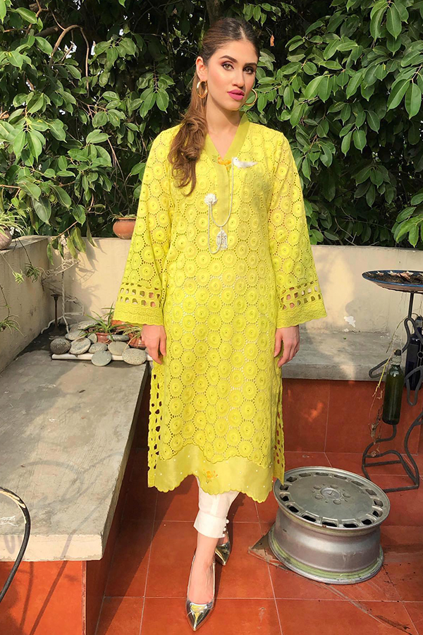 Chikan shirt half lined till the waist with lawn fabric is embellished with 3D multi-colored embroidered buttons and scalloped organza hemline with pearls spray. Paired with corrine cuffed pants.