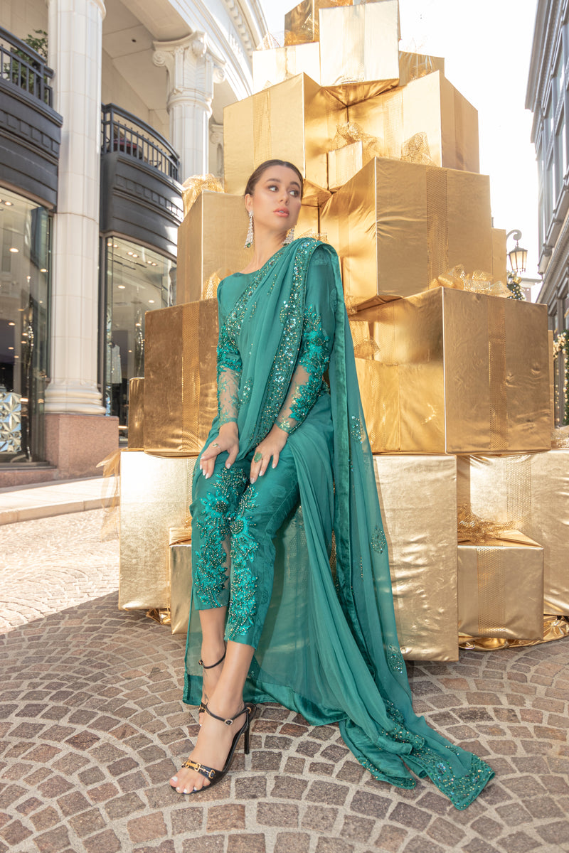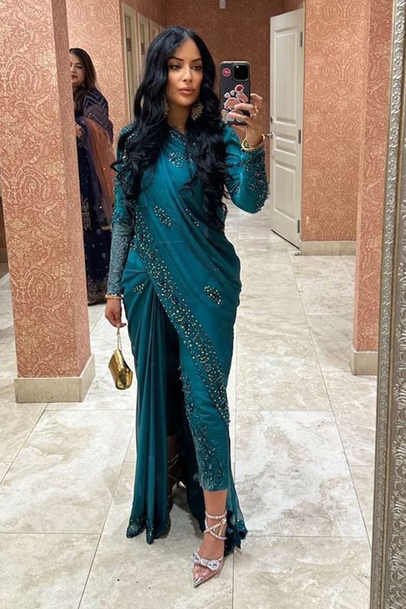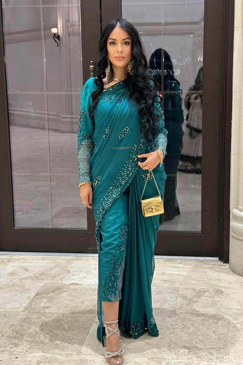 Dive into elegance with these Chiffon saree pants in enchanting Ocean Green. Intricate hand embellishments, sequins, beadwork, and zari lace create a masterpiece. Paired effortlessly with raw silk pants, it's a symphony of sophistication and style.