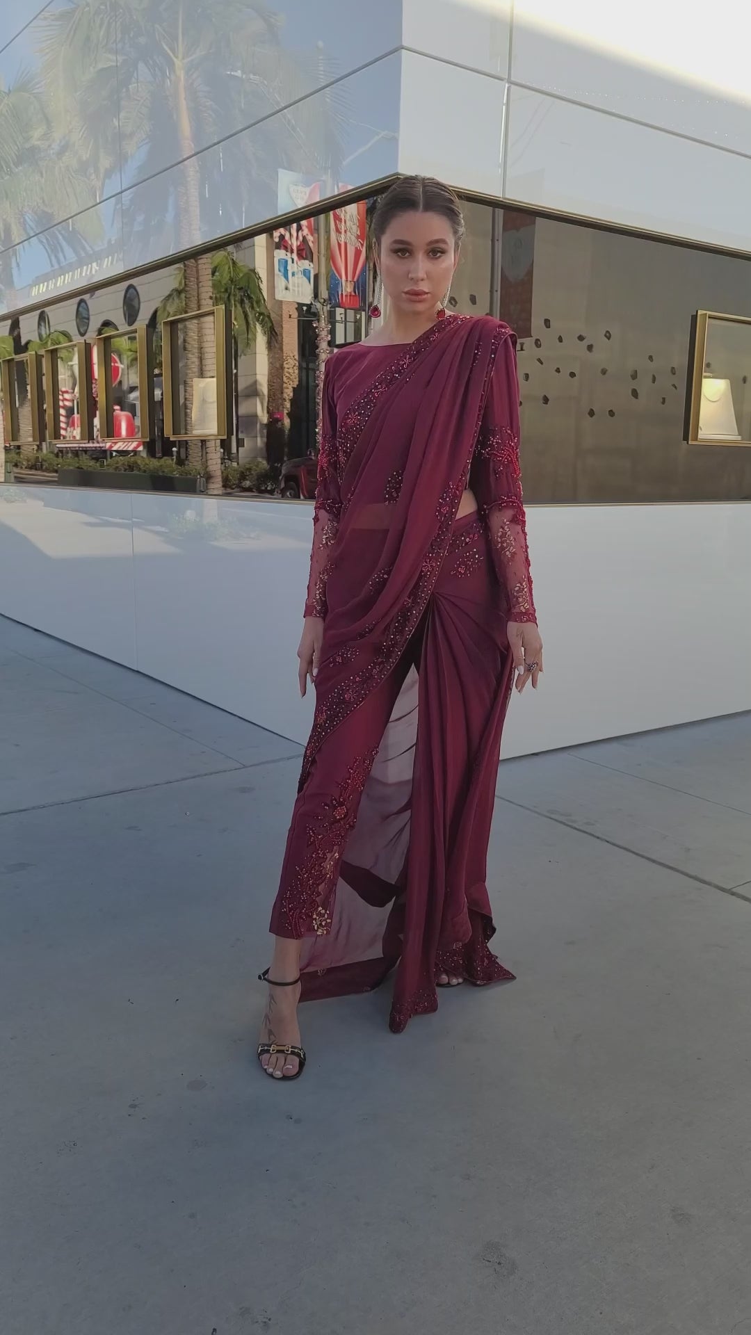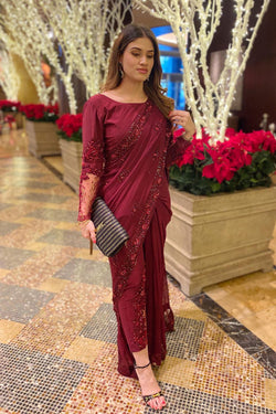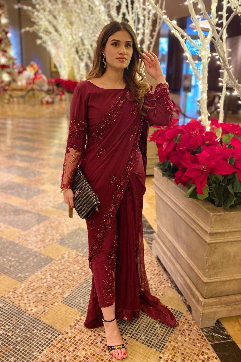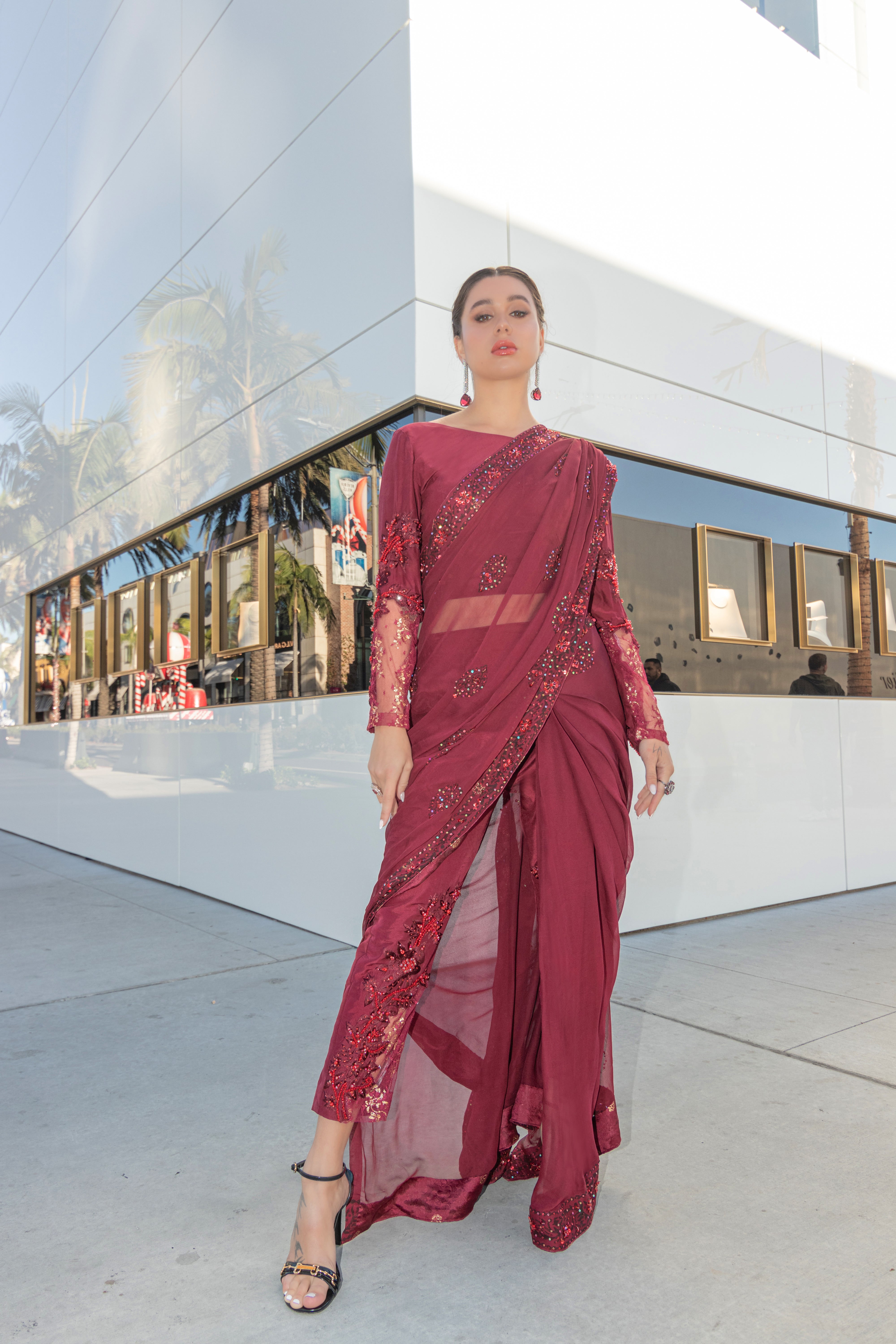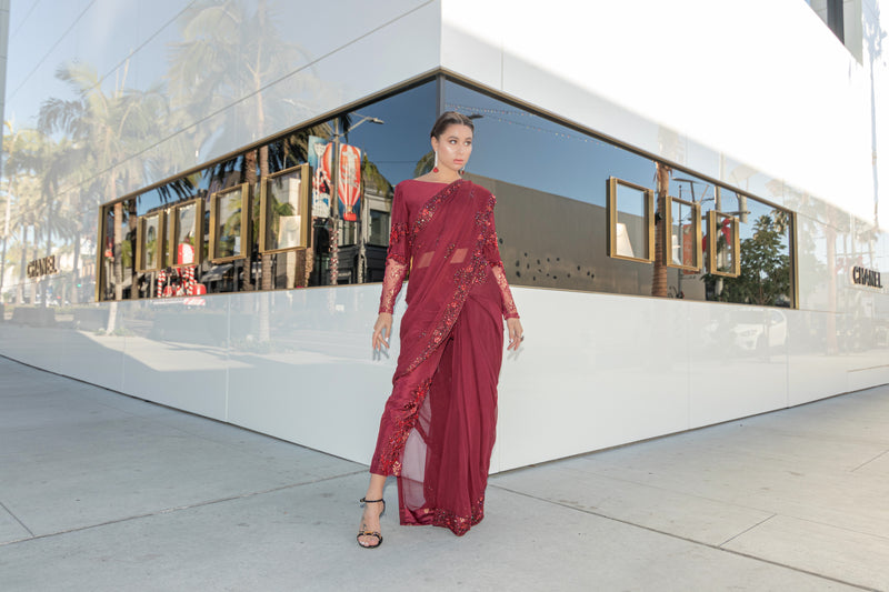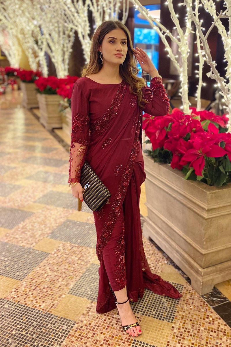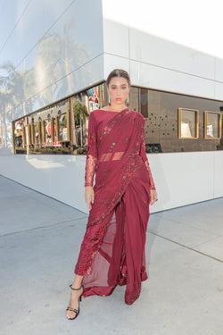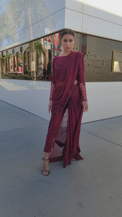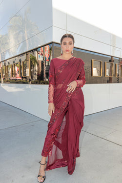 Embrace opulence in the rich hues of ruby red with these Chiffon saree pants. Meticulous hand embellishments, sequins, beadwork, and exquisite zari lace elevate the allure. Paired seamlessly with raw silk pants, it's a timeless symphony of grace and glamour.