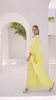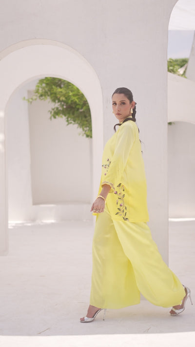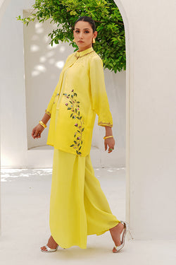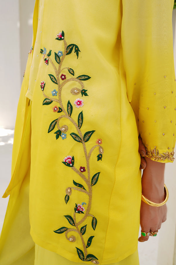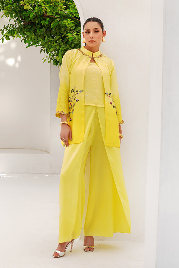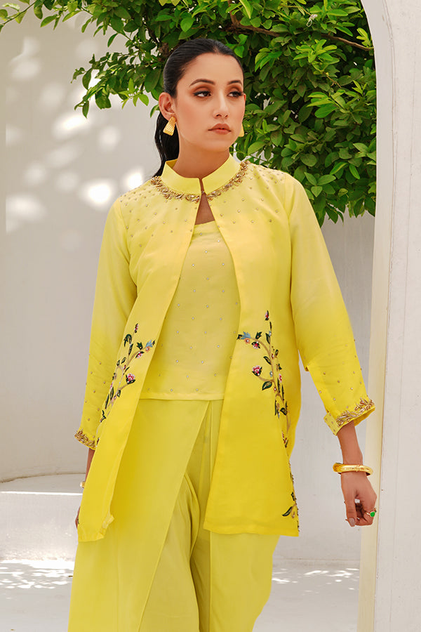 This radiant ensemble is a perfect blend of modern elegance and traditional glamour, designed to make a graceful yet striking impression. Crafted from luxurious raw silk, the outfit features a two-tone color palette, creating visual richness and dimension. The highlight of the ensemble is a vibrant yellow embroidered jacket, which brings a burst of warmth and festive charm to the look. The jacket is intricately adorned with gold sequin and stone work, strategically placed along the neckline and sleeves. These embellishments shimmer gently under light, adding a refined sparkle that enhances the richness of the yellow base. The neckline, likely cut in a modest round or soft V-shape, is framed with meticulous detailing—golden sequins hand-set around the edges, interspersed with subtle stones that reflect elegance and grandeur. The sleeves, which may be full or three-quarter in length, feature matching embellishment, creating a sense of cohesion and balance. Worn underneath is a sleek undershirt, crafted from raw silk in a subtle contrasting or coordinated tone—possibly a lighter cream, soft gold, or pastel hue—that enhances the vibrance of the yellow without overpowering it. The undershirt ensures structure and modesty while adding a layering effect that is both stylish and functional. The ensemble is completed with elegantly tailored tulip pants, a modern reinterpretation of traditional bottoms. The tulip cut, with its soft draping folds and overlapping hemline, adds graceful movement and a touch of contemporary flair. These pants, likely in the same tone as the undershirt or in a slightly deeper hue, bring the entire look together with balance and poise.