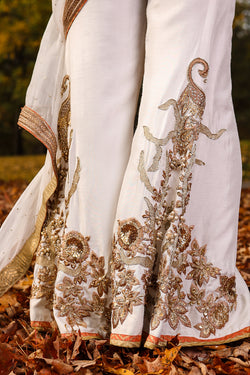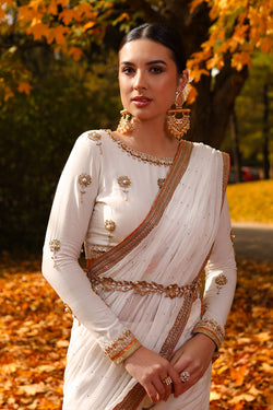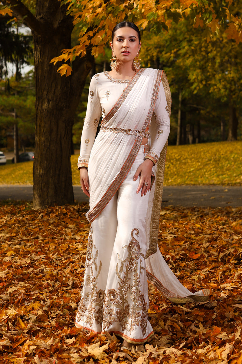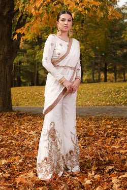 Gulbadan - A pristine white outfit features a classic blend of a traditional saree blouse paired with contemporary sharara pants. The attached saree drape in Mukesh chiffon adds a touch of elegance. The embroidered pants are lavishly embellished with pearls, rhinestones, beads, and sequin work, creating a sophisticated and timeless ensemble that's perfect for special occasions.