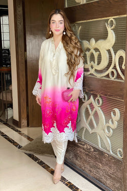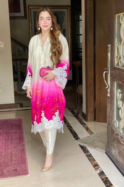 Pure raw silk hand-painted boxed kurta with 3D floral embroidered flowers on the neckline and lace border on hem and sleeves. Paired with raw silk Lace trimmed khari shalwar.