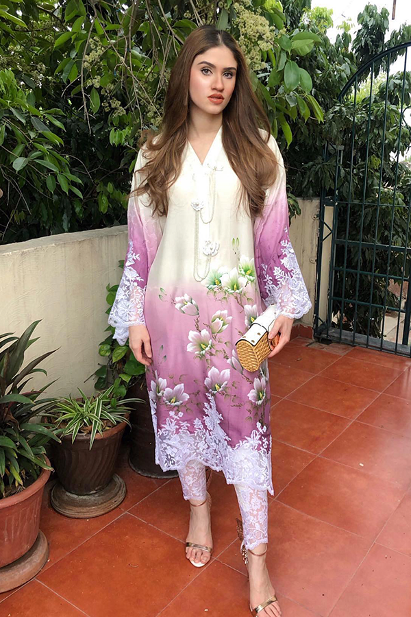 Pure raw silk hand-painted boxed kurta with 3D floral embroidered flowers on the neckline and lace border on hem and sleeves. Paired with raw silk Lace trimmed khari shalwar.