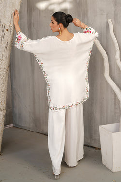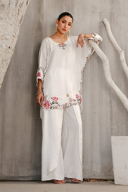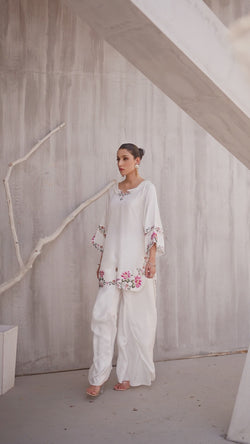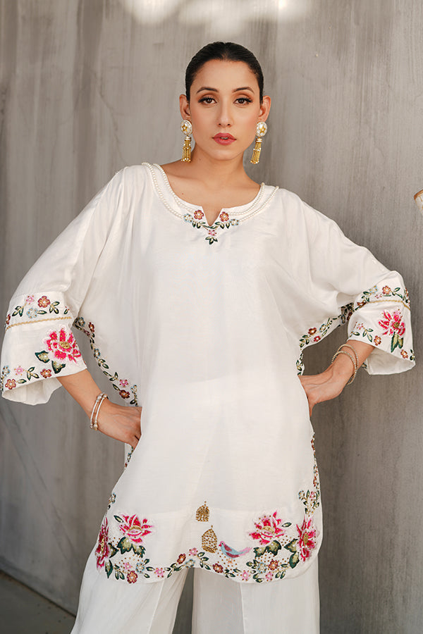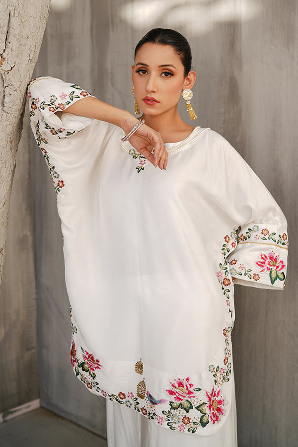 This vibrant and exquisitely detailed ensemble brings together timeless elegance and lively charm. Crafted in luxurious raw silk, the outfit features a multi-colored embroidered top, where intricate threadwork in a variety of rich hues comes together to create a visually captivating and artistic design. The embroidery—most likely a mix of floral and traditional patterns—is laid out across the front of the top, creating a stunning tapestry of color and craftsmanship against the crisp backdrop. The base of the top is a clean, elegant white, which not only enhances the vibrancy of the multicolored embroidery but also gives the outfit a fresh, polished, and sophisticated appeal. Adding to the ornate beauty of the top are delicate pearl and stone embellishments, thoughtfully placed along the neckline, sleeve cuffs, and scattered within the embroidery. The pearls bring in a classic, understated elegance, while the stones add a subtle sparkle that catches the light—perfect for daytime glamour or evening refinement. Paired with this beautiful top are tulip pants, also in matching white raw silk (or in coordinated tones for other color variants). The tulip pants are elegantly draped with a petal-like overlap at the hem, bringing a contemporary touch and fluid movement to the look. Their minimal design balances the ornate top perfectly, offering comfort and sophistication in one. This white embroidered raw silk dress, accented with multi-colored threadwork, pearls, and stones, and paired with tulip pants, is ideal for Eid, festive brunches, intimate get-togethers, or formal day events. It’s a seamless blend of tradition, color, and contemporary tailoring.