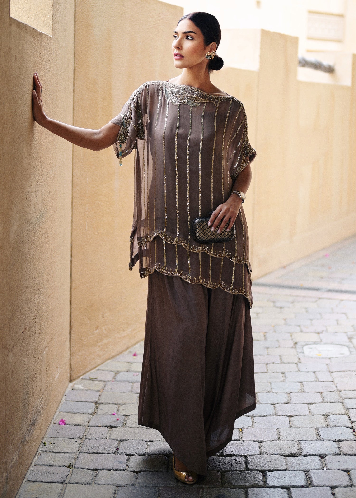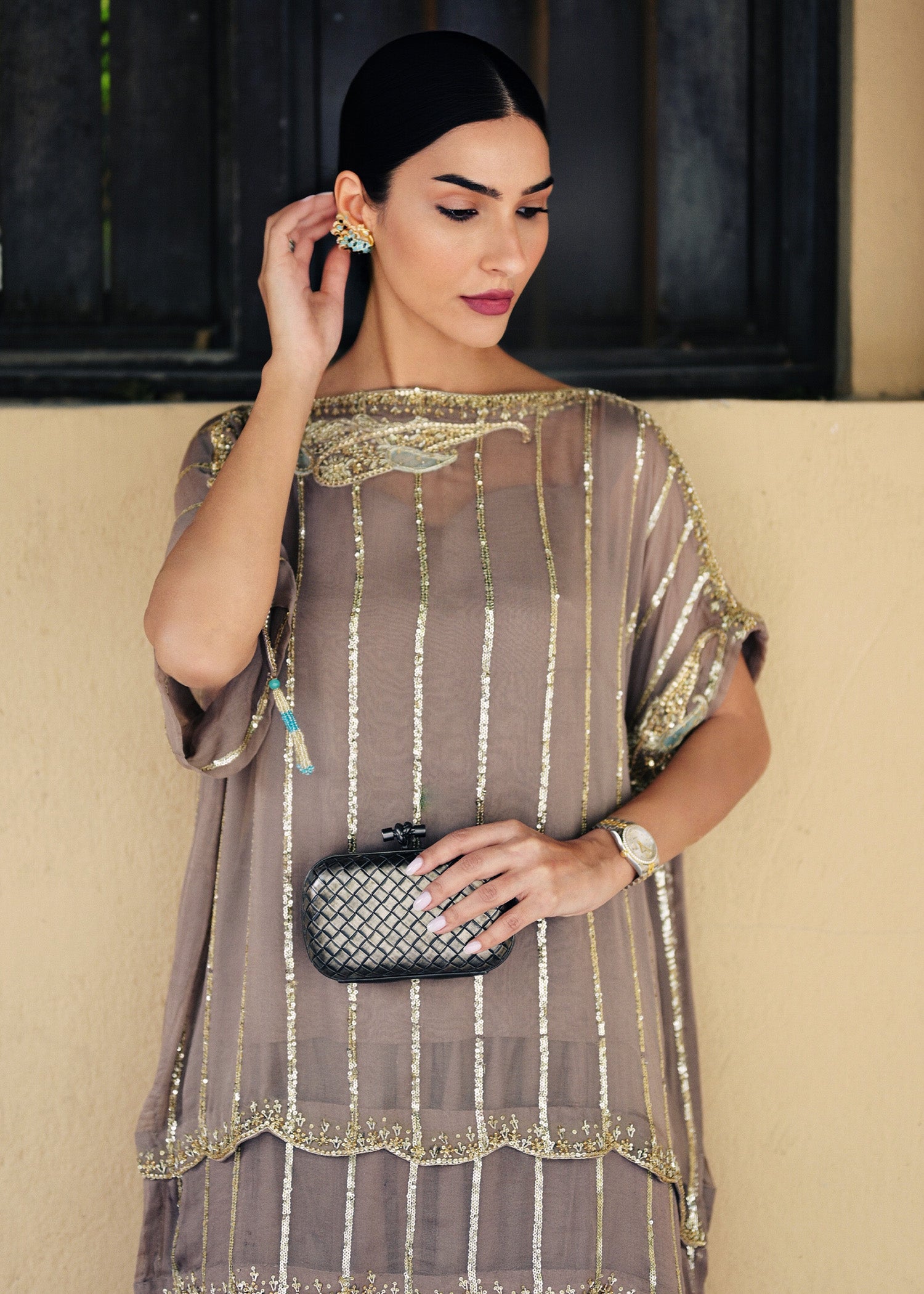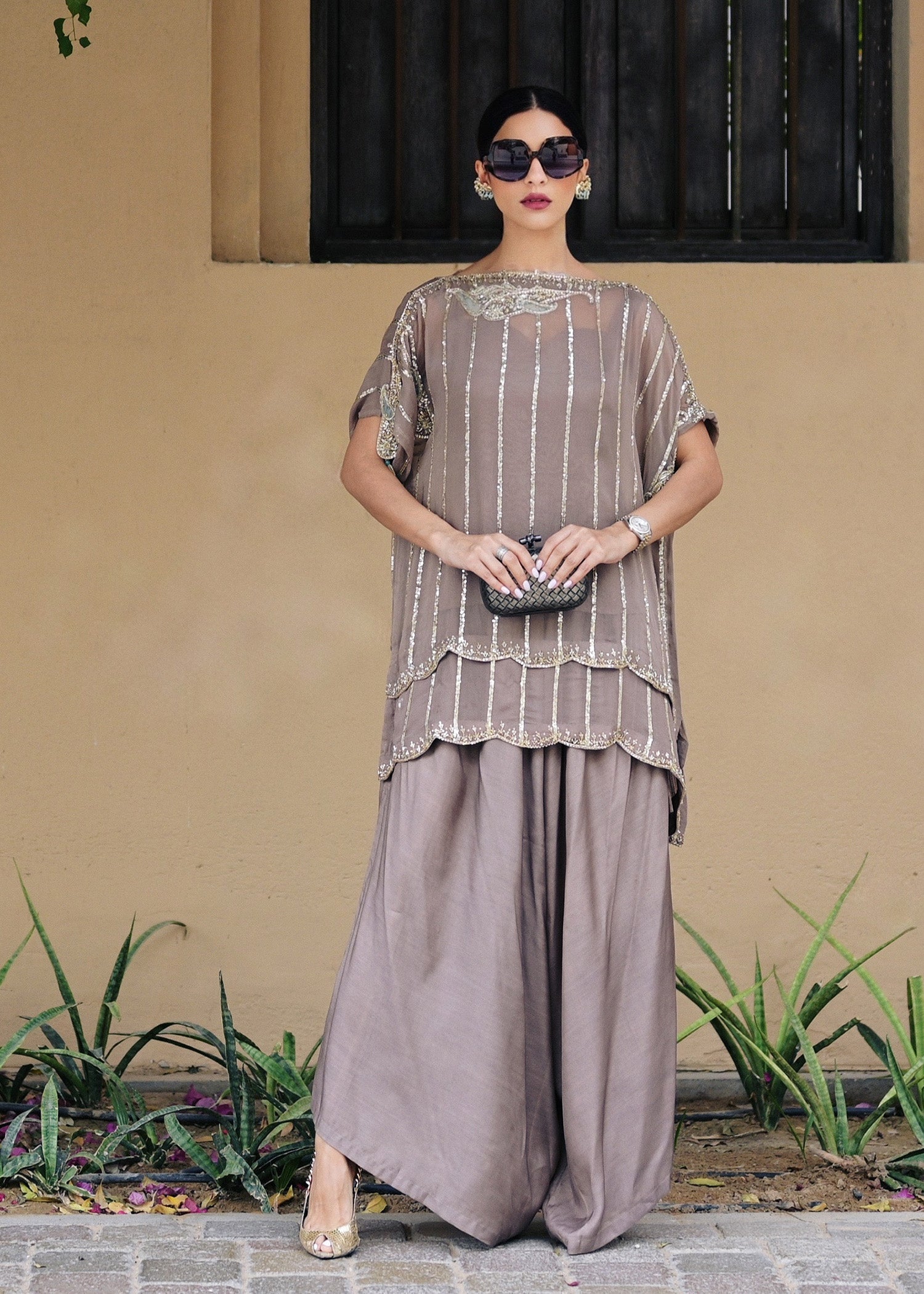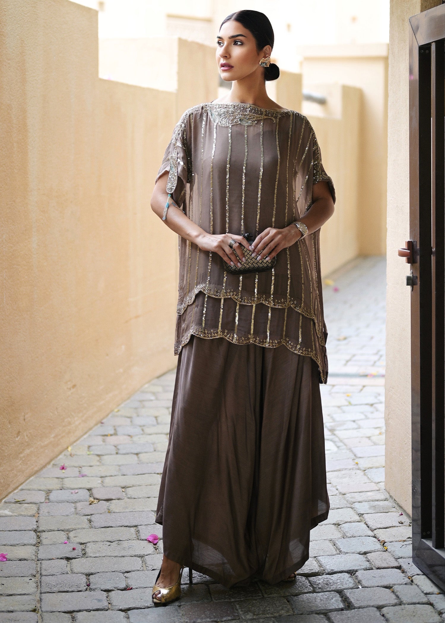Sequence Chiffon poncho with hand work on neckline and sleeves and hemline paired with silk dhaka shalwar