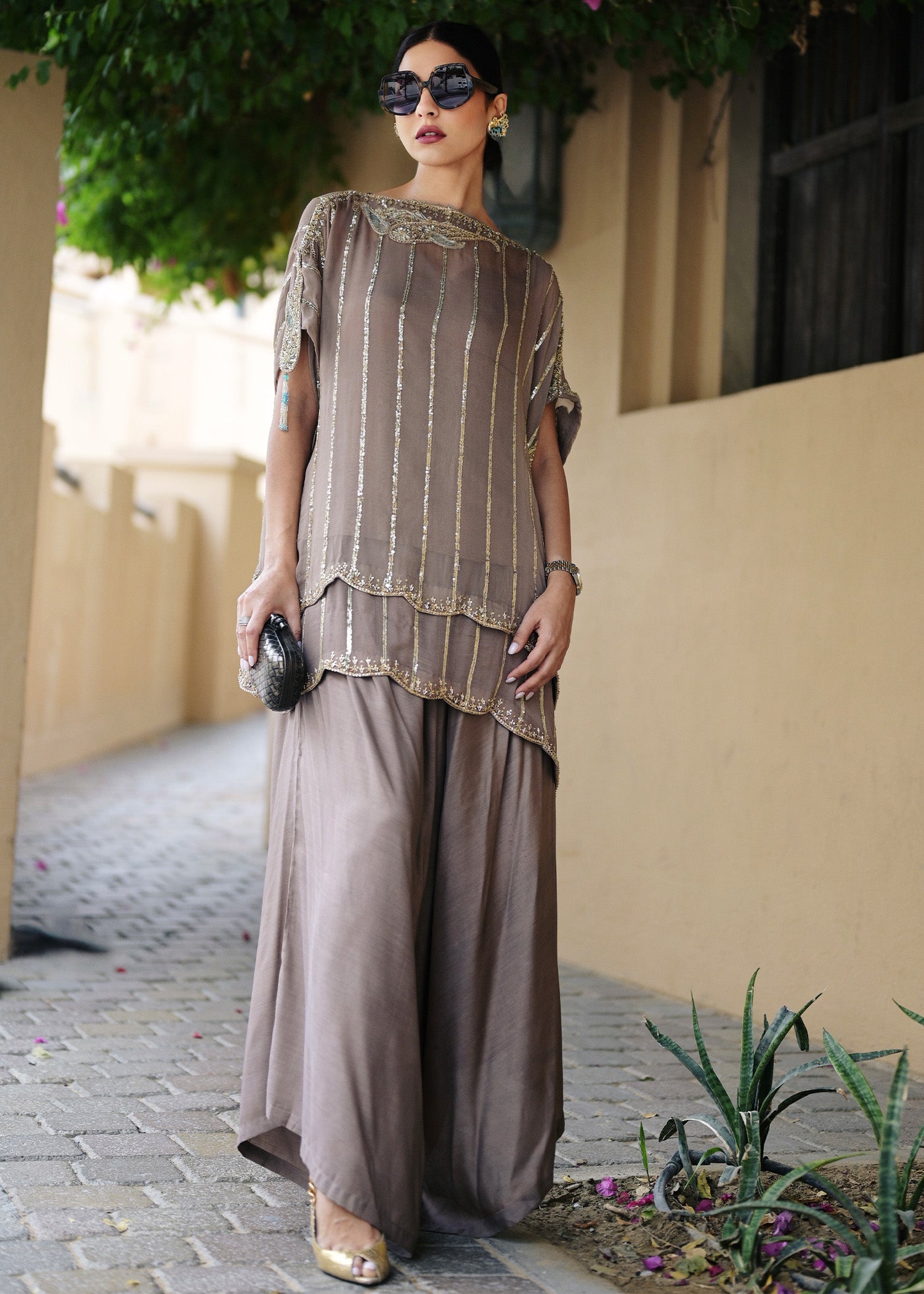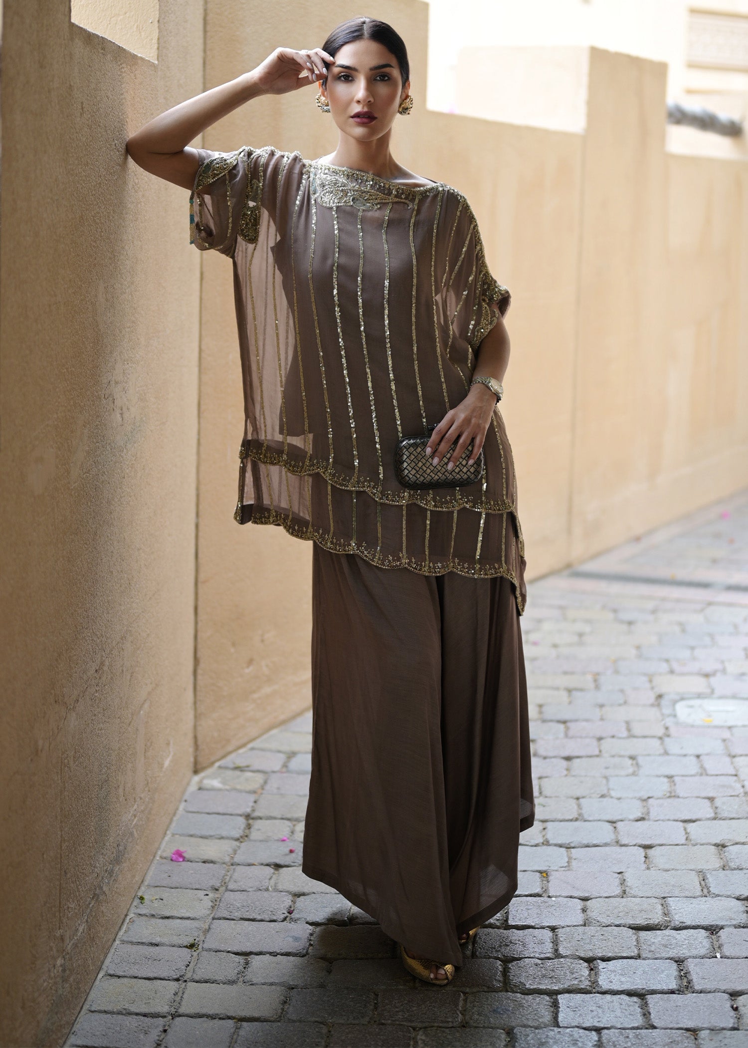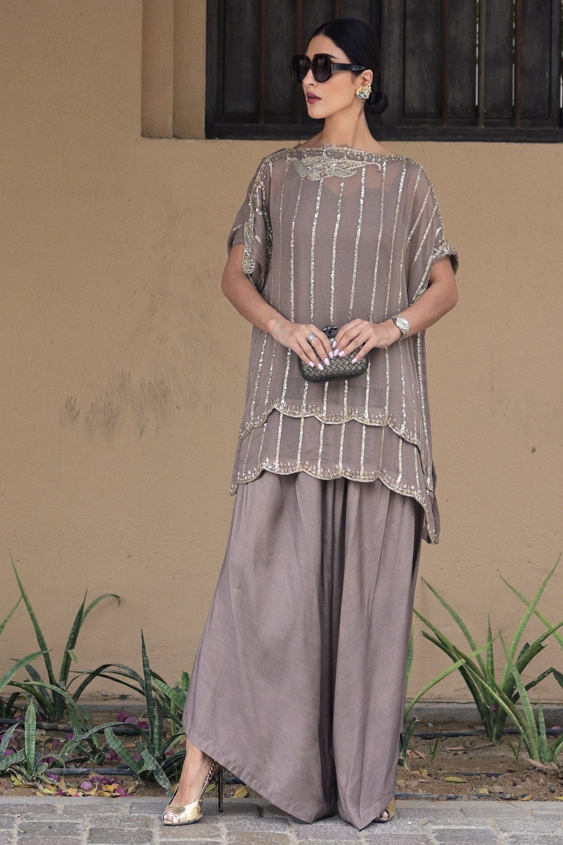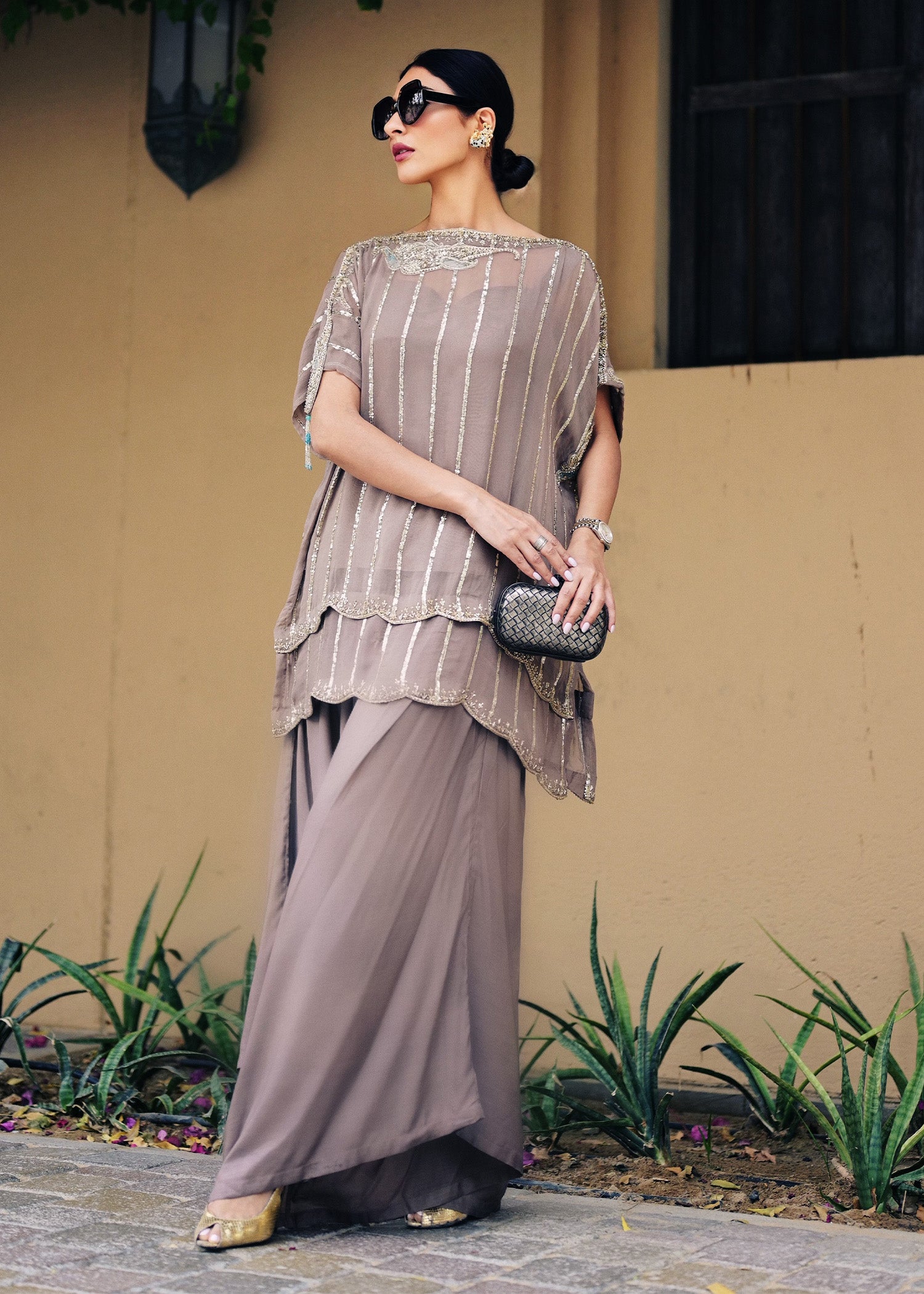Sequence Chiffon poncho with hand work on neckline and sleeves and hemline paired with silk dhaka shalwar