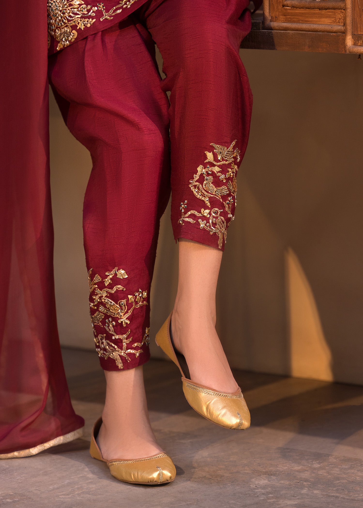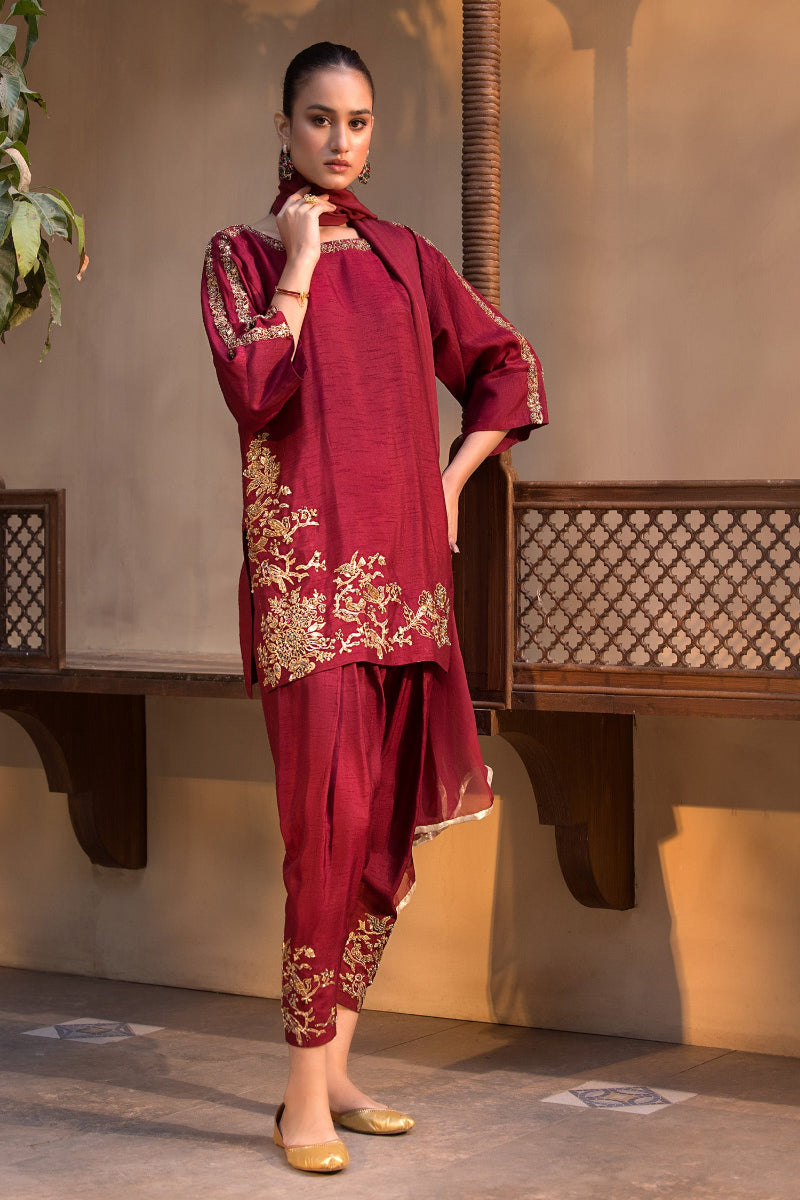 Traditional boxed shirt with khari shalwar Hand embelished zari work on hemline ,neckline and khari shelwar paired with chiffon Dupatta.