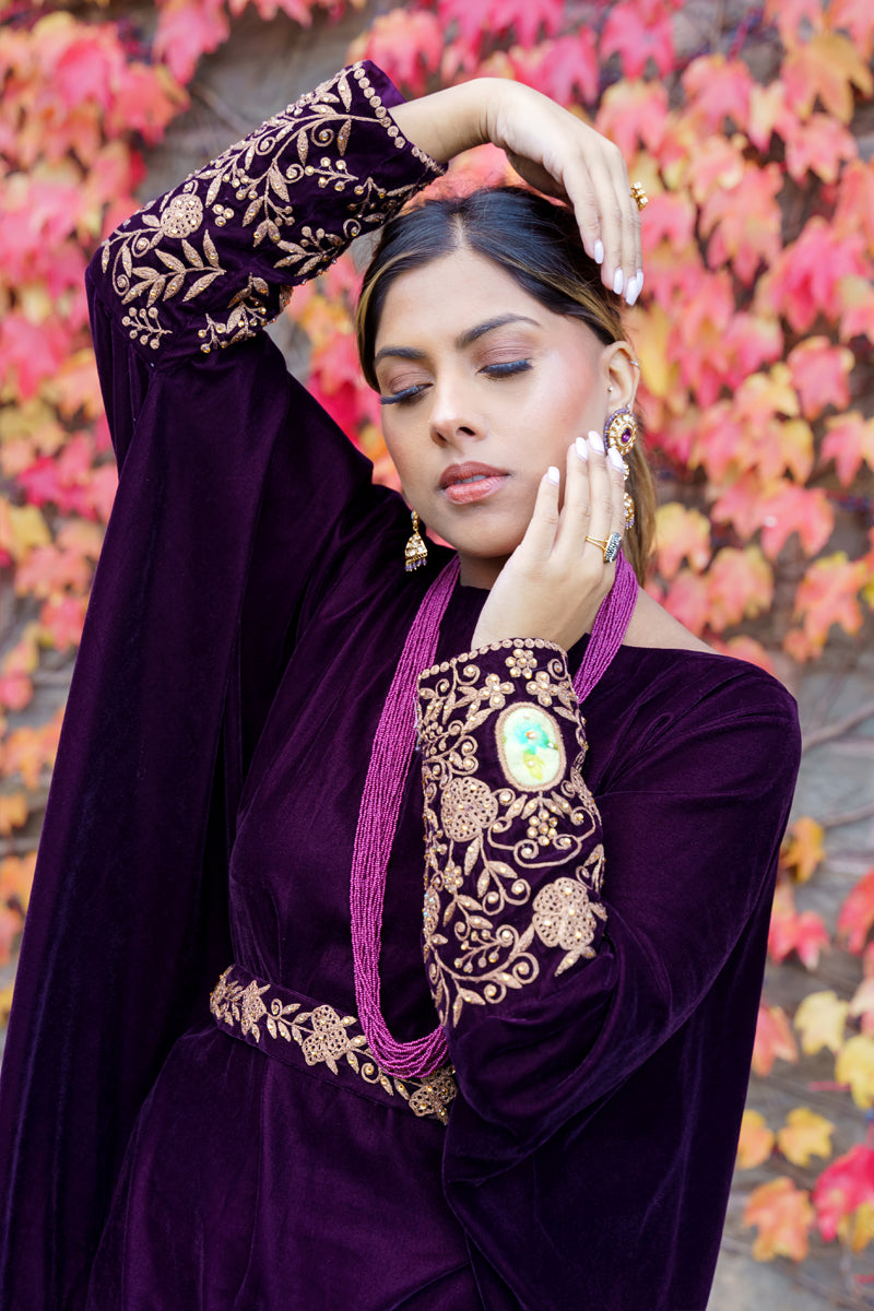 ''Maharani” This eggplant ottoman-style high low belted kaftan is a masterpiece, featuring an antique tilla ari worked cuffs and belt. The hand-painted floral appliqué adds a touch of artistry to the velvet fabric. The antique worked cuffed pants make it an opulent and exquisite choice for any special occasion.