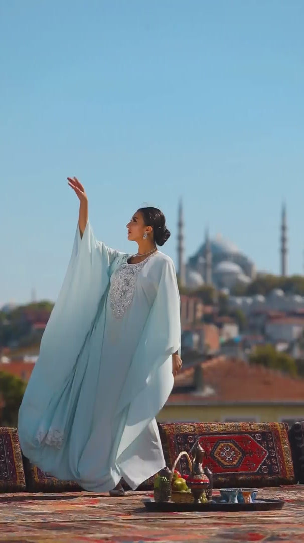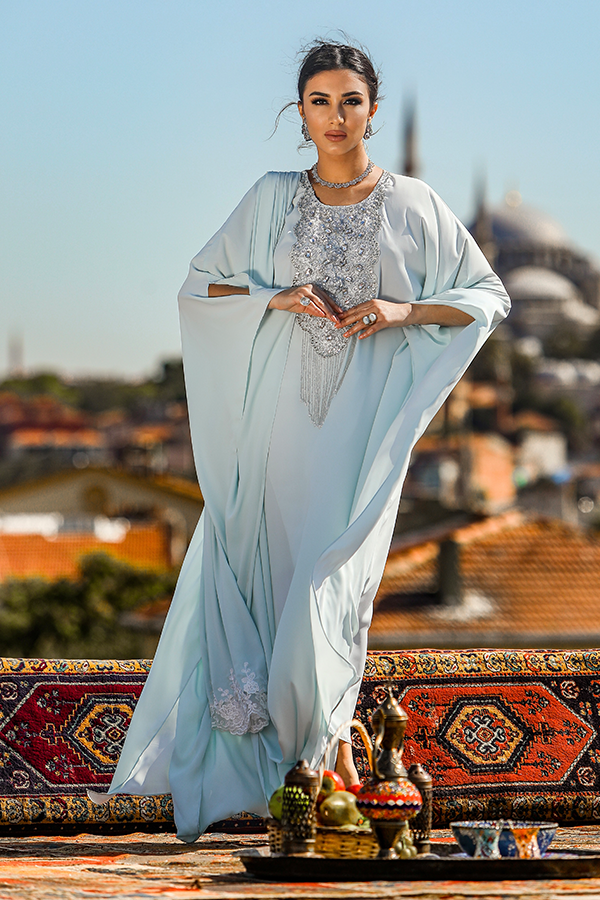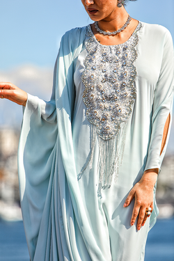 Mushk-e-haya is an ice blue georgette Saree kaftan crafted with lace and stone work on the neckline fused with hanging beads on the neckline and lace trim on the border radiated elegant charm and splendor.