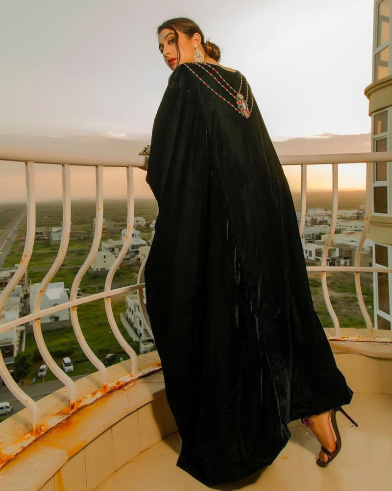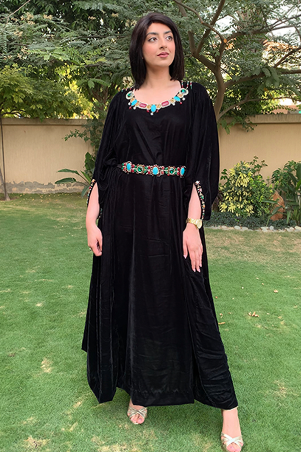Girls in the twin cities is carrying this glorious black velvet kaftan with utter charm and grace. Adorned with classic embellishments and stonework rendered into culturally inspired design, the details ethereally enhance the allure of this modern cut. Her magical style of carrying this outfit is adding to the mythical aura of this look!
