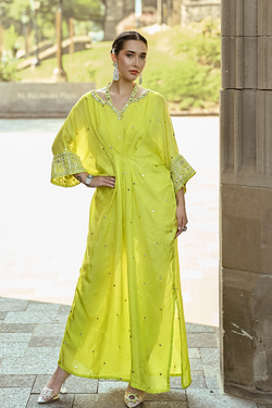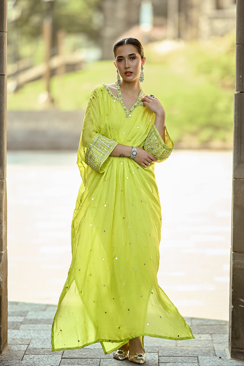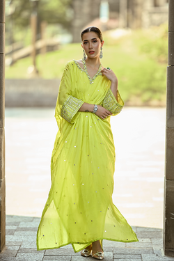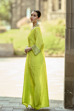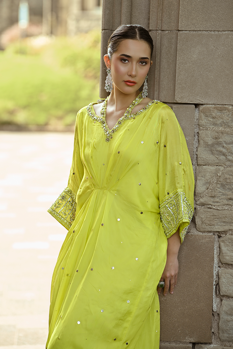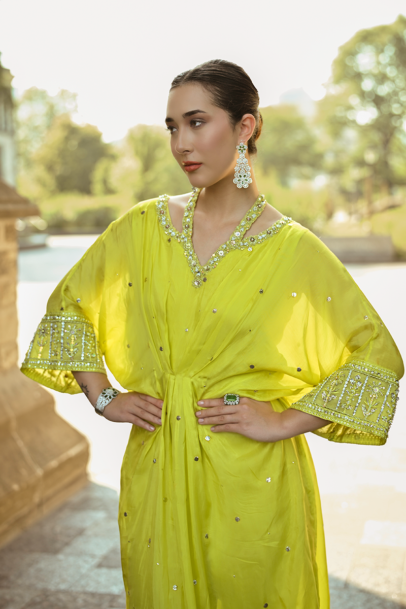 Neon Grace is a pure silk kamdani kaftan in a striking neon hue, radiating bold sophistication. The kaftan features exquisite handwork, with an intricately embellished halter neckline and detailed sleeves that add refined elegance to its flowing silhouette. Paired with cotton silk pants and a camisole, this ensemble blends contemporary vibrance with timeless craftsmanship. Perfect for festive occasions and evening gatherings, it embodies effortless glamour and modern charm.