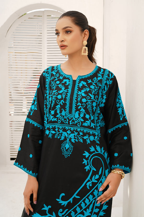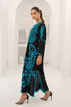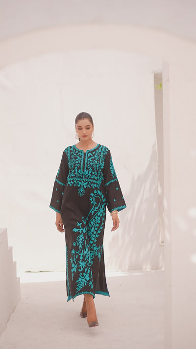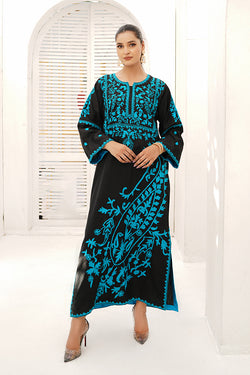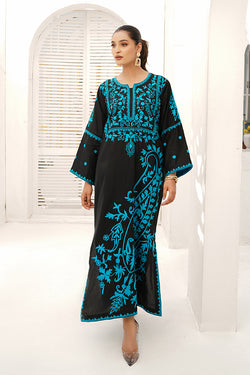 This striking ensemble showcases a full-length kaftan, a timeless silhouette known for its flowing elegance and effortless charm. Crafted from soft and breathable cotton silk, the kaftan offers a perfect balance of comfort and luxury. The fabric’s natural sheen adds a subtle richness, making the outfit suitable for both casual sophistication and formal wear. The kaftan is rendered in classic black, serving as a bold and versatile base that highlights the detailed embroidery beautifully. Adorning the entire surface are intricate embroidered motifs, thoughtfully spread across the front, back, and sleeves. These embellishments feature paisley patterns—a traditional motif with Persian origins, often associated with timeless grace and cultural heritage. The paisleys are finely detailed, possibly stitched using tonal or contrasting threads to create depth and texture. The embroidery may be highlighted with subtle hints of metallic threadwork, lending a delicate glint to the overall look without overpowering its minimal sophistication. The loose, floor-length cut of the kaftan drapes fluidly over the body, allowing for graceful movement and a universally flattering fit. Its relaxed structure is often cinched slightly at the waist or left completely free, depending on the desired look—whether flowy and bohemian or more structured and formal. This black paisley kaftan is a perfect statement piece for festive gatherings, evening dinners, or cultural occasions, offering a fusion of traditional artistry and modern elegance wrapped in comfort.