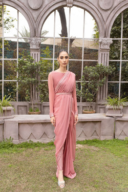 Noor-e-Hira is an arctic light pink chiffon saree paired with panni worked fully embellished pants. It is adorned with panni worked border all over the saree, sleeves, and belt reviving the beauty of ceremonial essence.