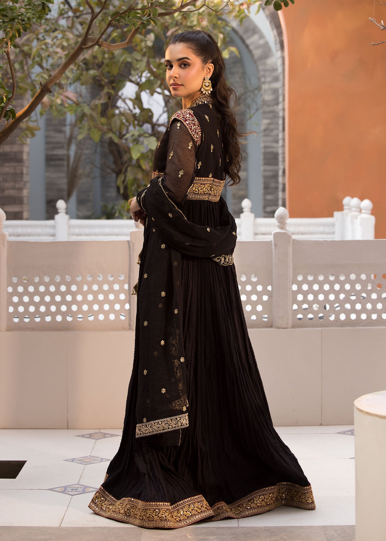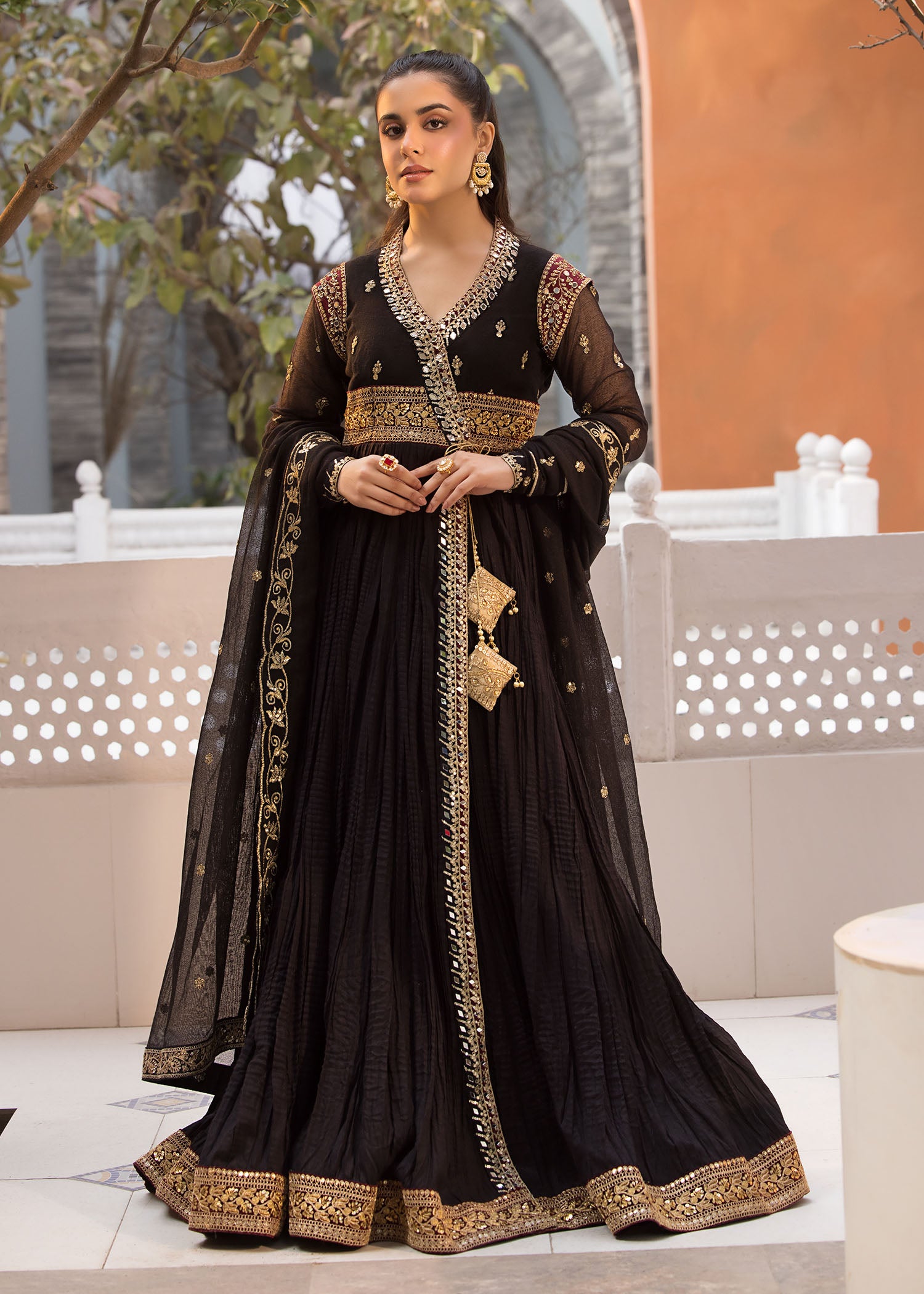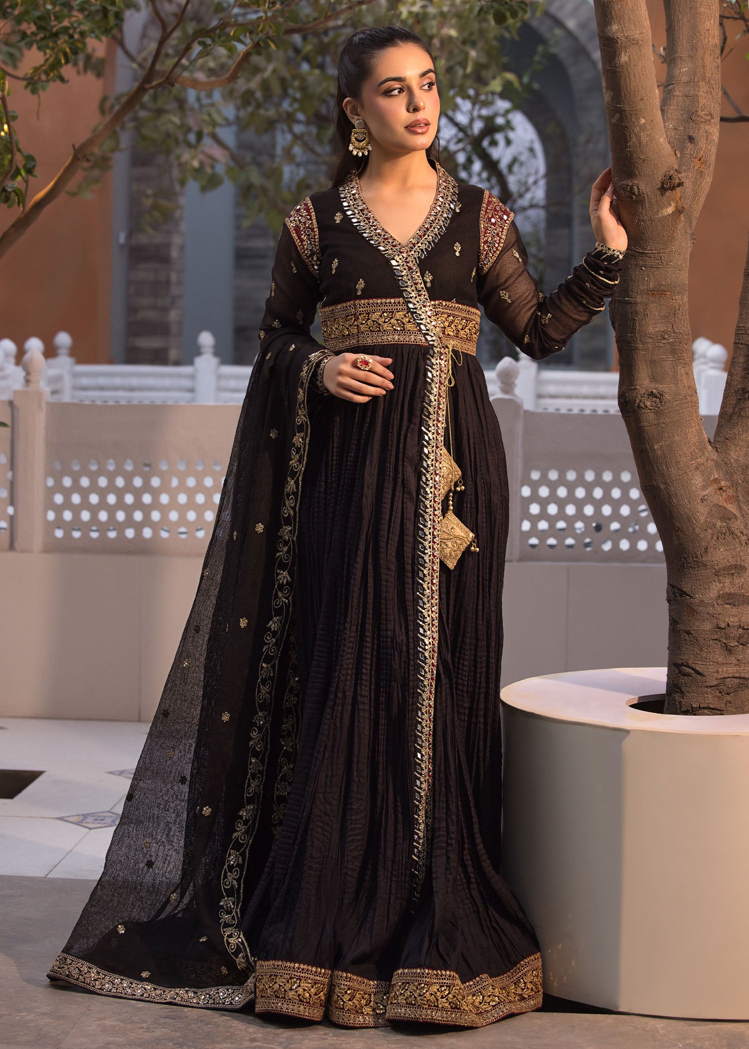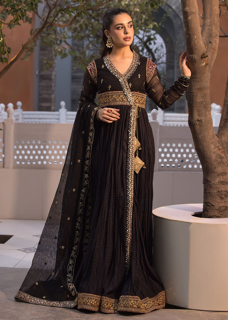 Traditional crushed anarkali angrakha with antique tilla and mirror work on bodice with chooridar sleeves paired with zari worked Dupatta and Silk Pants.
