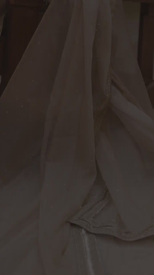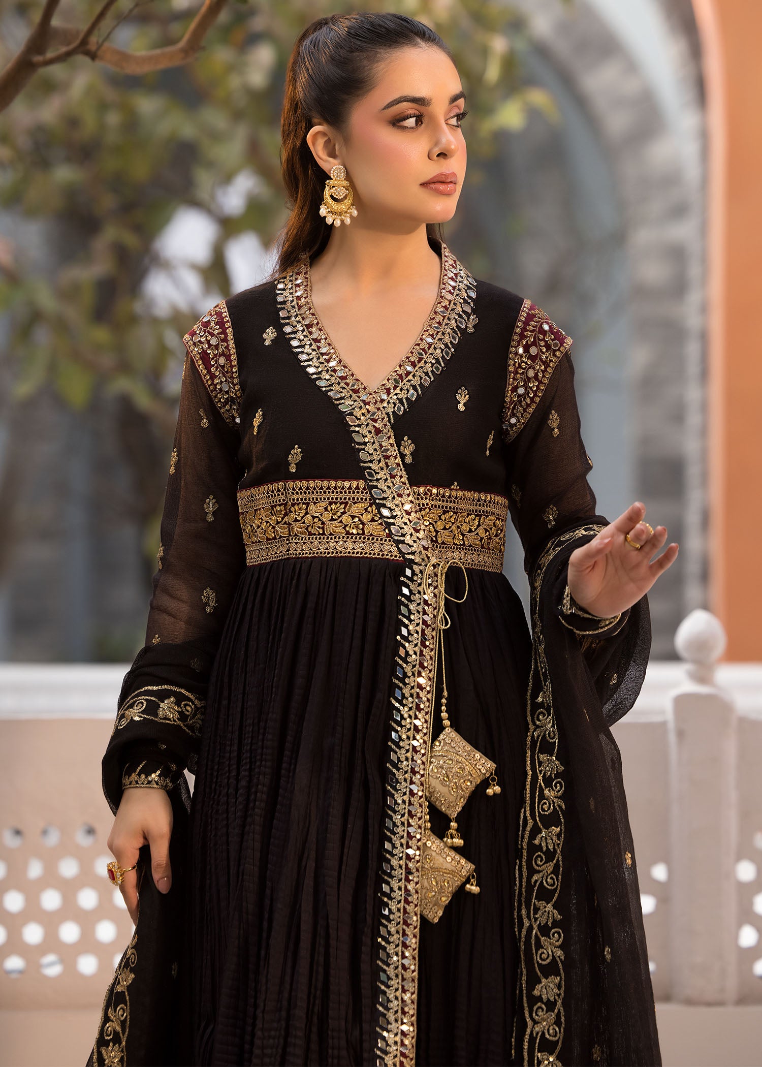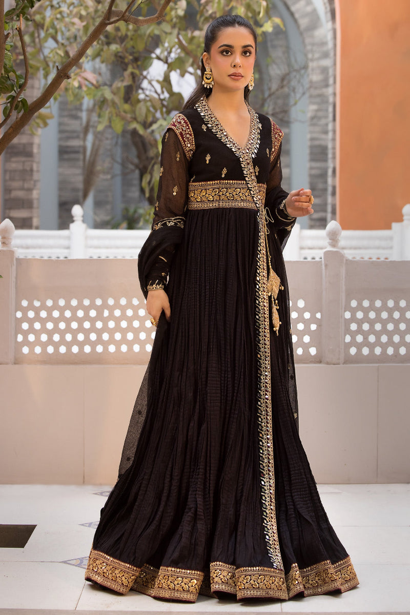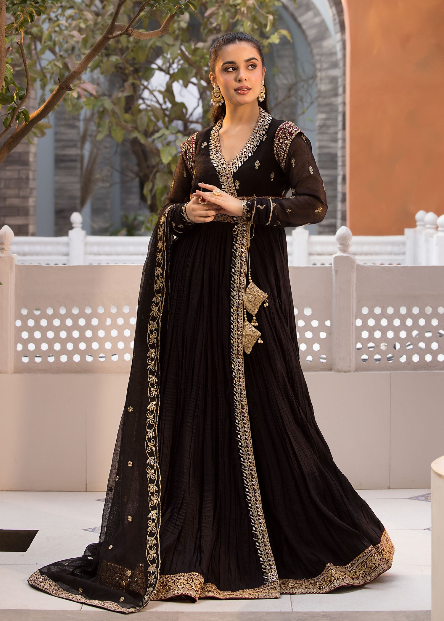 Traditional crushed anarkali angrakha with antique tilla and mirror work on bodice with chooridar sleeves paired with zari worked Dupatta and Silk Pants.