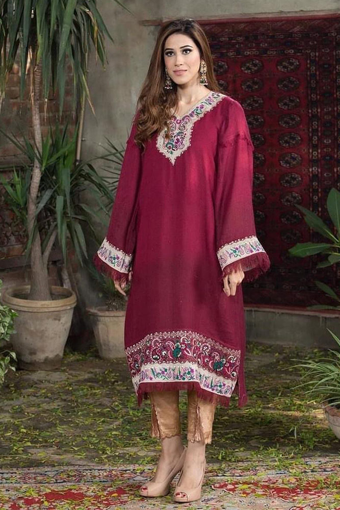 Pashmina Kurtas by Sadia Tariq for this fall Our crimson coloured pashmina kurta featuring beautifully crafted intricate hand embroidery with a color palette of nude, green, magenta, fuchsia and lilac along the neckline, cuffs and border. Pair it with our Front slit champagne silk pants.