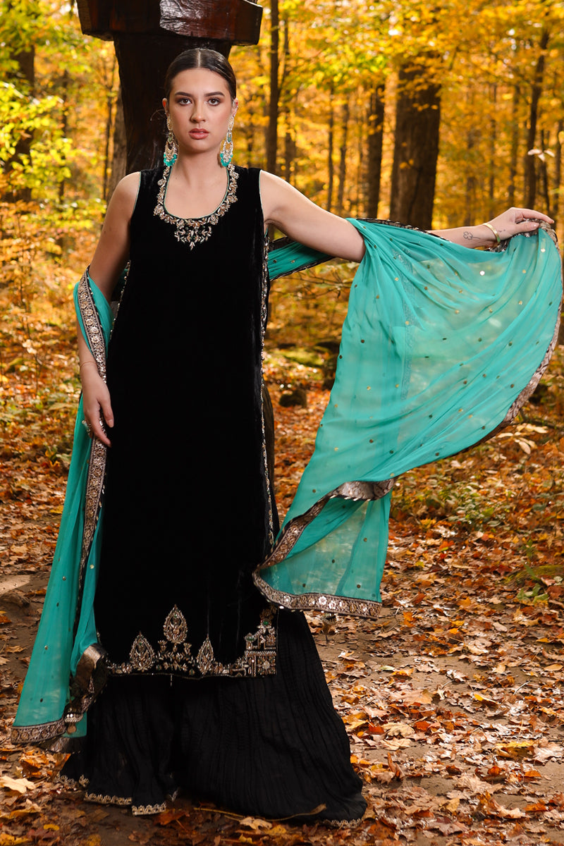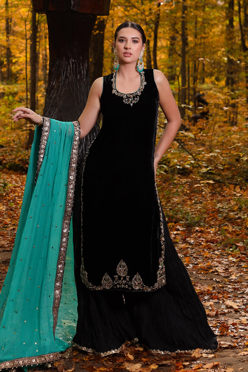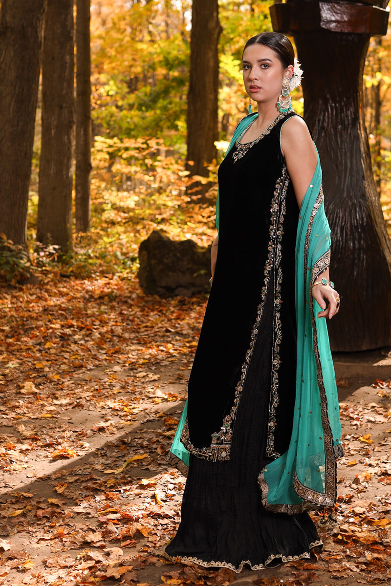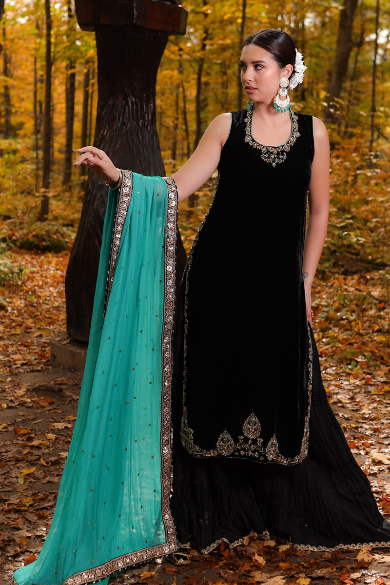Pukhraj' is a striking black attire featuring a luxurious velvet shirt, elegantly paired with silk crushed sharara and a chiffon Mukesh dopata. The shirt is adorned with exquisite kora, dabka, and nakshi work, accentuated by a hint of emerald stones, adding a touch of timeless elegance to this classic outfit.