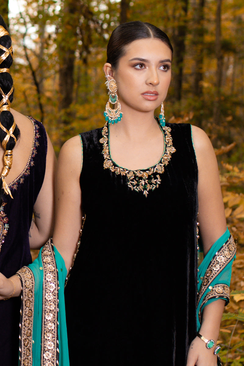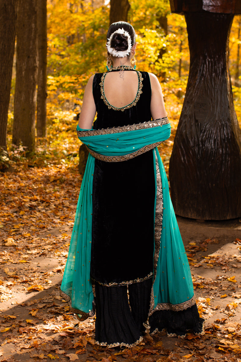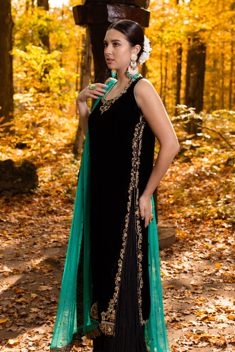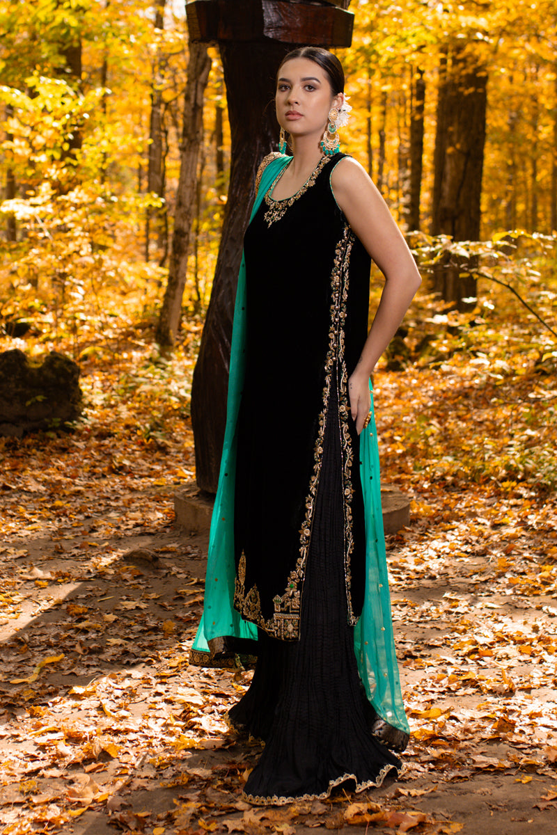 Pukhraj' is a striking black attire featuring a luxurious velvet shirt, elegantly paired with silk crushed sharara and a chiffon Mukesh dopata. The shirt is adorned with exquisite kora, dabka, and nakshi work, accentuated by a hint of emerald stones, adding a touch of timeless elegance to this classic outfit.
