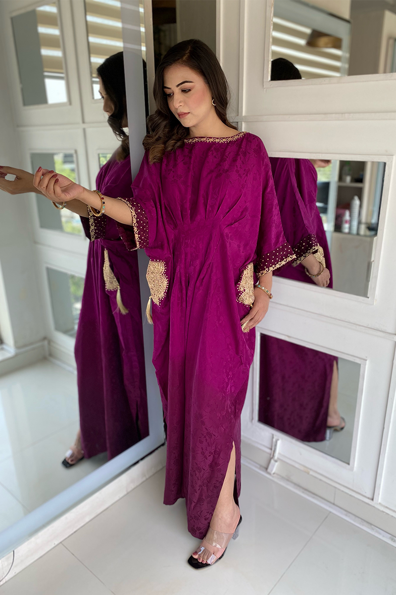 Full length pocket kaftan detailed with gold tilla and marori work in neckline sleeves and side pockets.