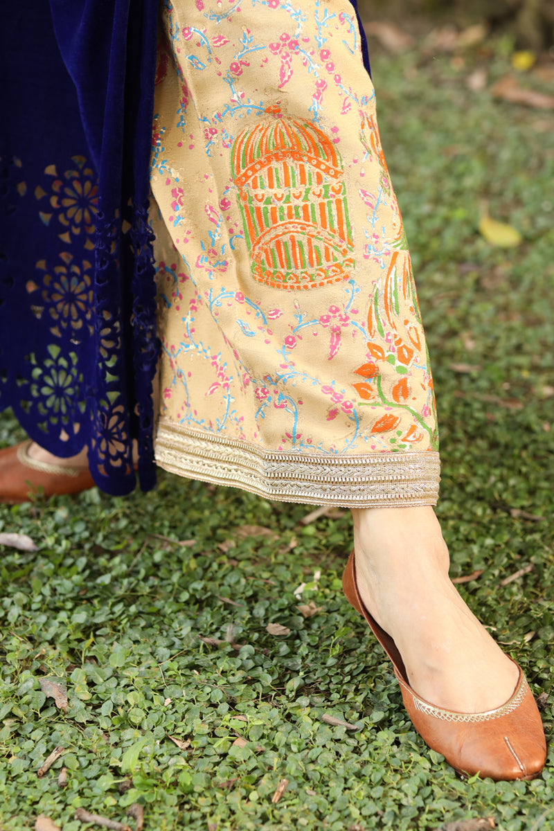 Introducing "Rani Haar". This ensemble showcases a straight, long, velvet box kurta paired with raw silk hand painted culottes, creating a stunning contrast. The velvet shirt features intricate pearl, beads and hand painted details around the neck with laser cut sleeves and border. This exquisite outfit is a perfect choice for special occasions.