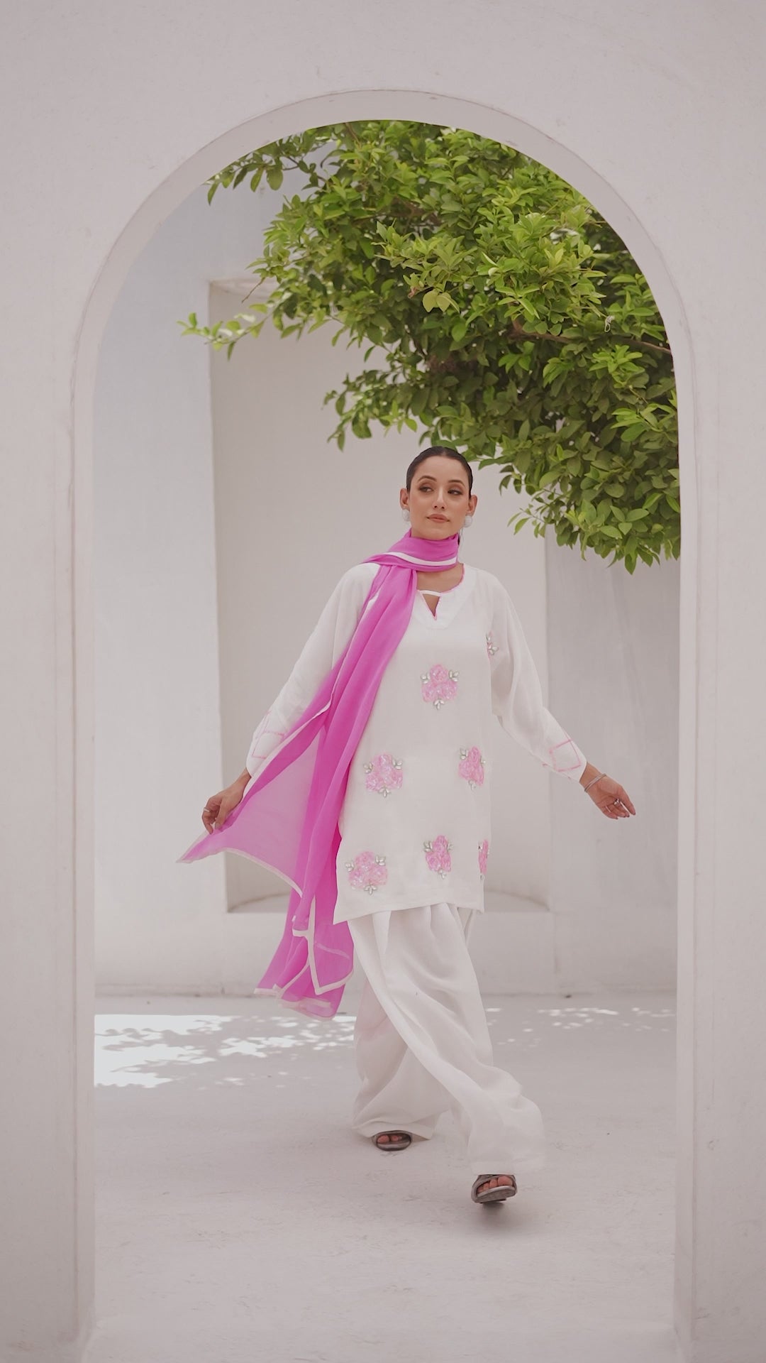 This timeless and romantic outfit is a celebration of traditional elegance infused with artisanal craftsmanship. The ensemble features a raw silk shirt that serves as the canvas for meticulously hand-worked sequin rose bunches, delicately scattered across the entire front of the shirt. Each rose motif is intricately crafted, with shimmering sequins arranged to form lifelike floral clusters that glisten subtly under the light, lending a dreamy, feminine charm to the outfit. The richness of raw silk gives the shirt a luxurious texture and a graceful drape, making it suitable for festive occasions, intimate weddings, or formal gatherings. The natural sheen of the fabric enhances the sparkle of the hand embellishments without overwhelming them, allowing the intricate floral artistry to remain the focal point. Paired with this statement shirt is a traditional farshi shalwar, a voluminous and regal lower garment that flows generously and adds an old-world grandeur to the look. Crafted in matching raw silk or a complementary fabric, the farshi shalwar’s wide flare and structured fall beautifully balance the more fitted silhouette of the shirt, giving the outfit a graceful, heritage-inspired silhouette. To complete the ensemble, a chiffon dupatta in a two-tone color scheme adds softness and dimension. The dupatta features a blend of two harmonious shades—possibly a gradient of warm and cool tones like blush and ivory, or gold and pastel pink—that effortlessly complement the base outfit. The airy chiffon material brings lightness to the ensemble and offers a delicate contrast to the richness of the raw silk.