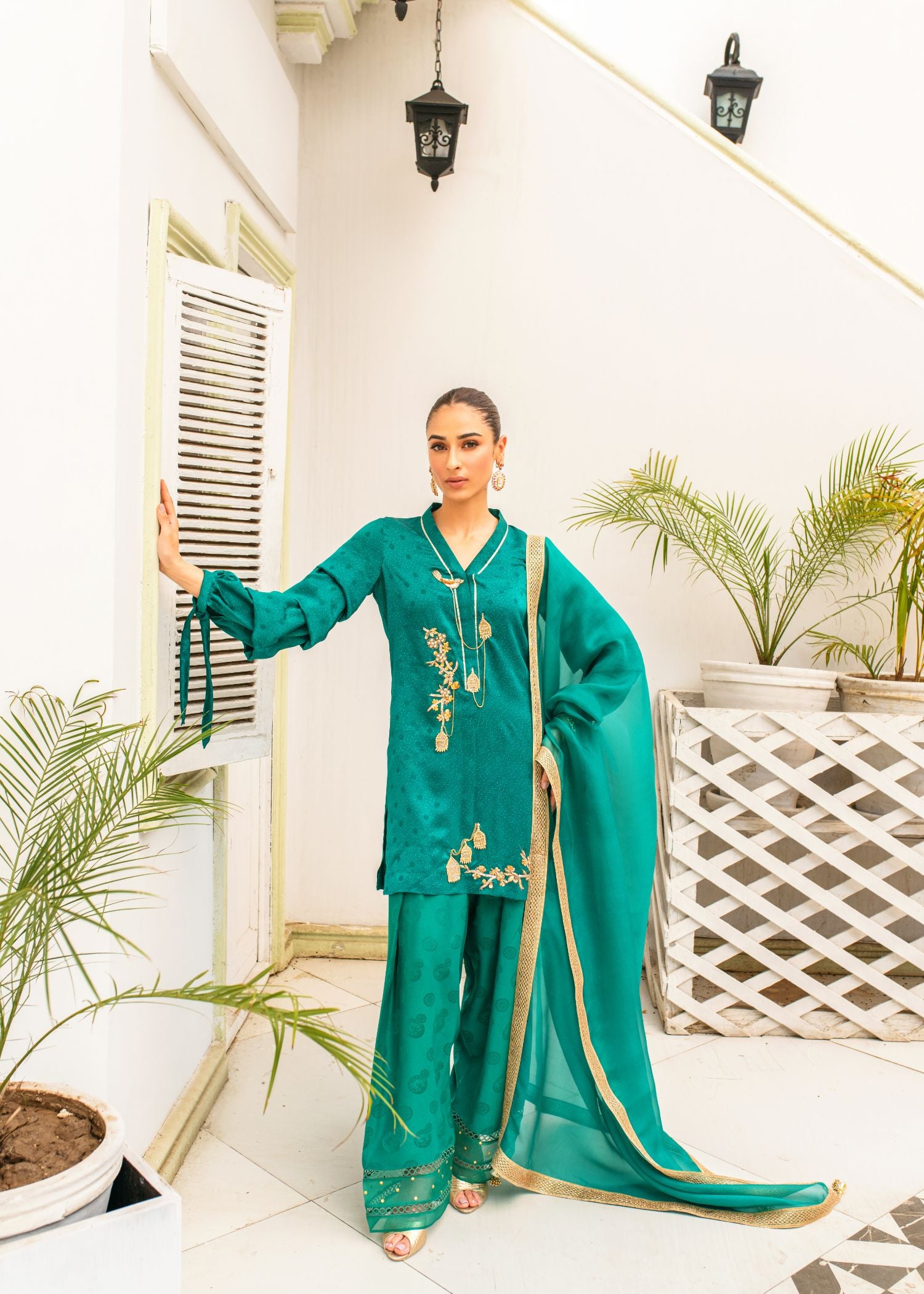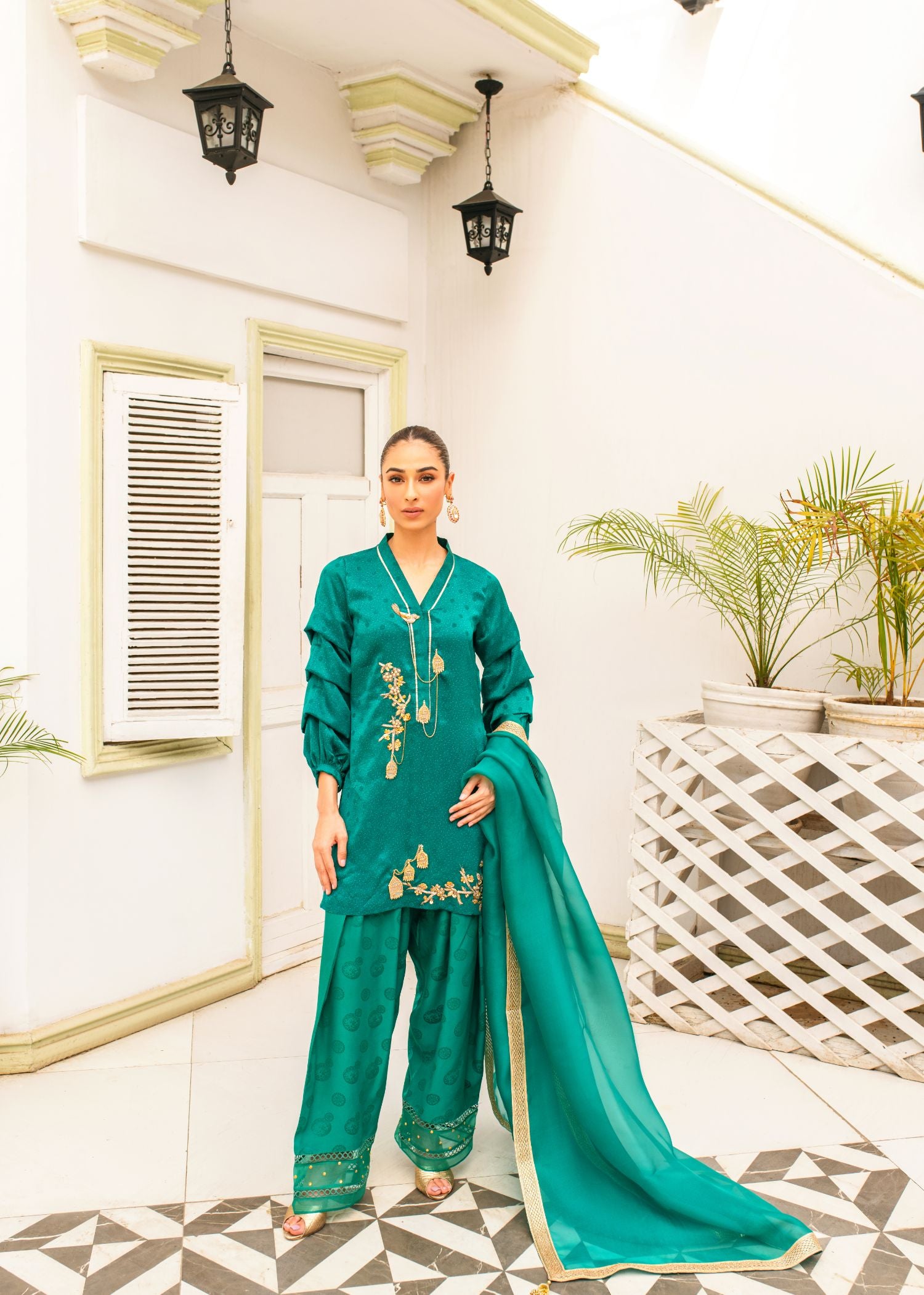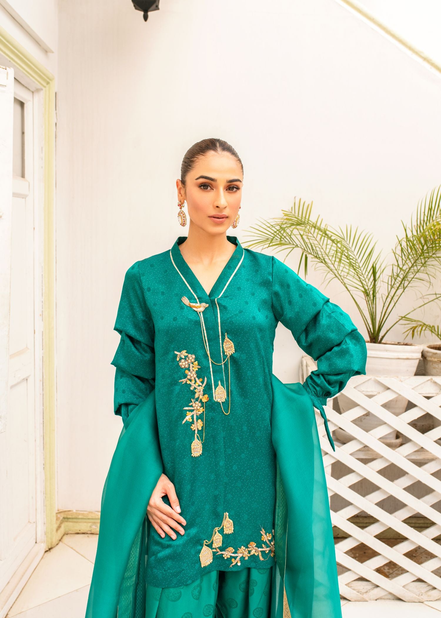 This elegant ensemble features an emerald green kameez with intricate handembroidered bird cage motifs, paired with a classic Punjabi shalwar. A delicate dupatta in sheer organza or luxurious chiffon completes the look, blending traditional craftsmanship with modern grace.