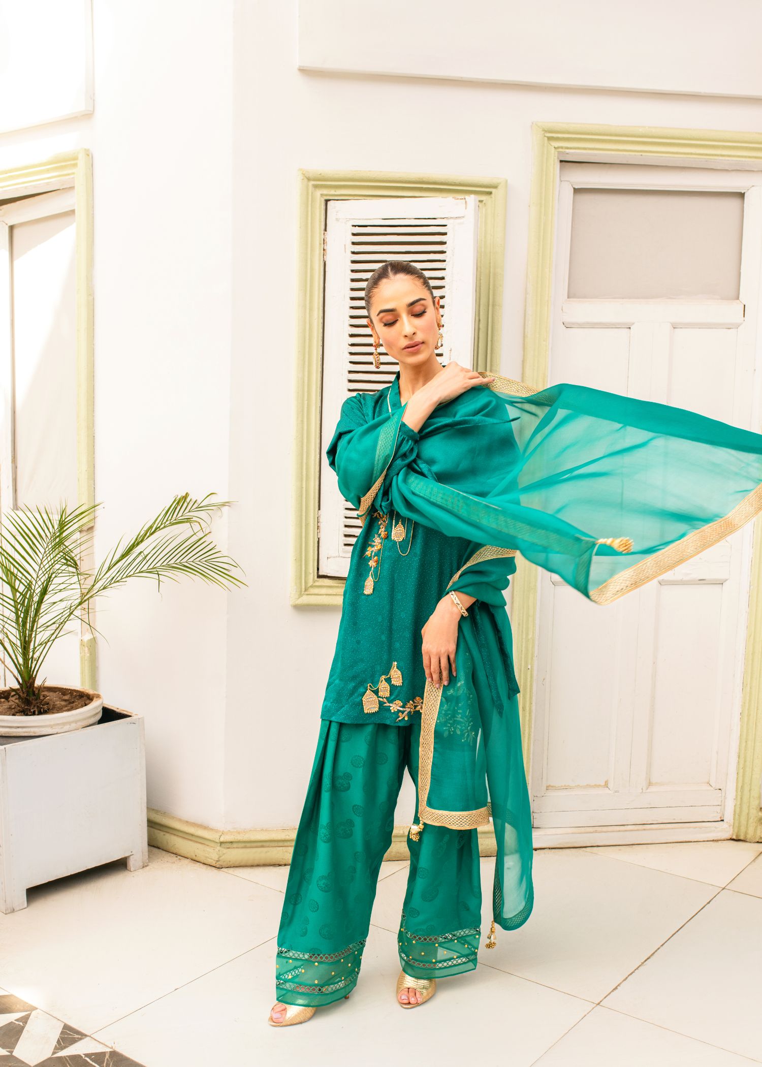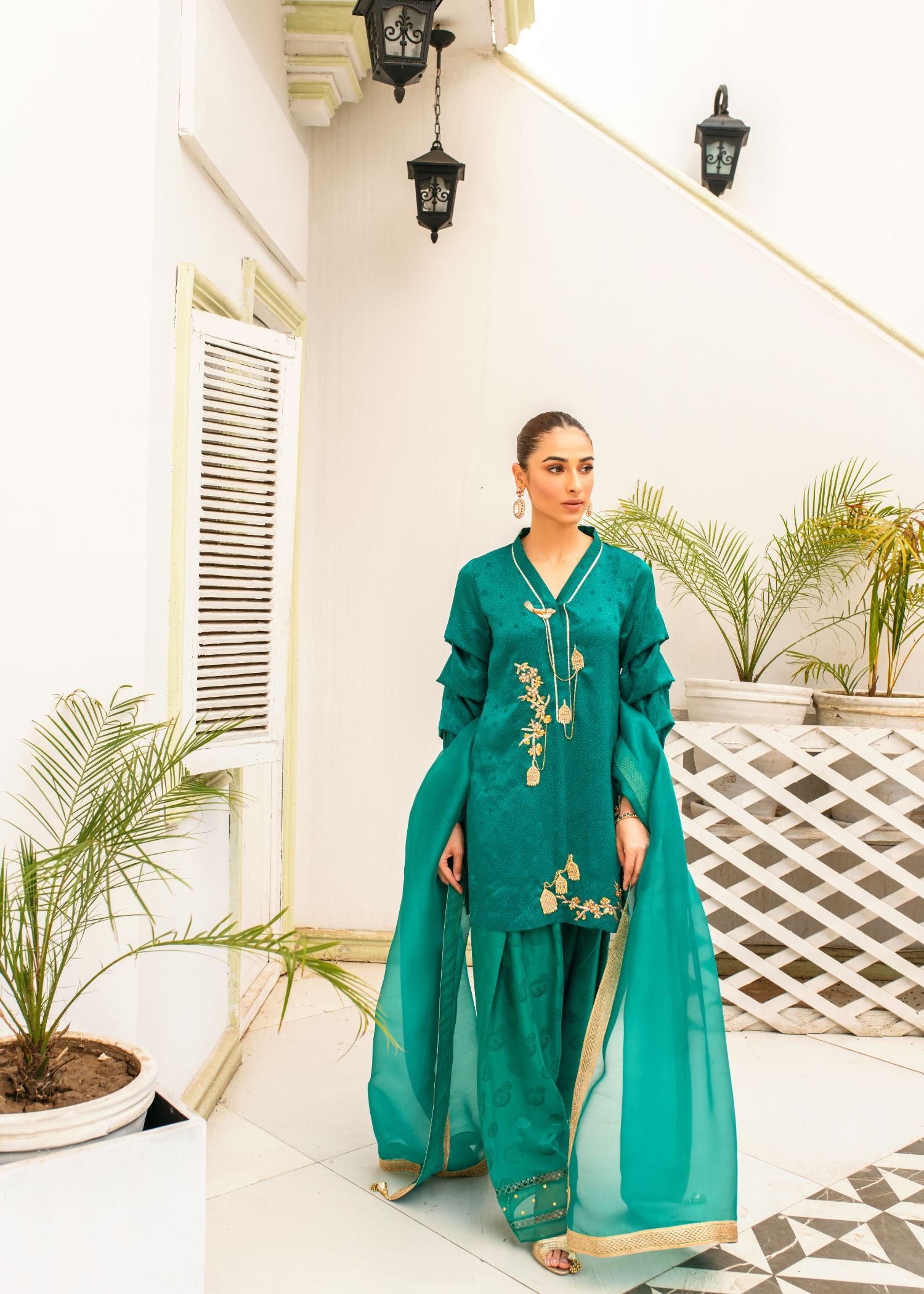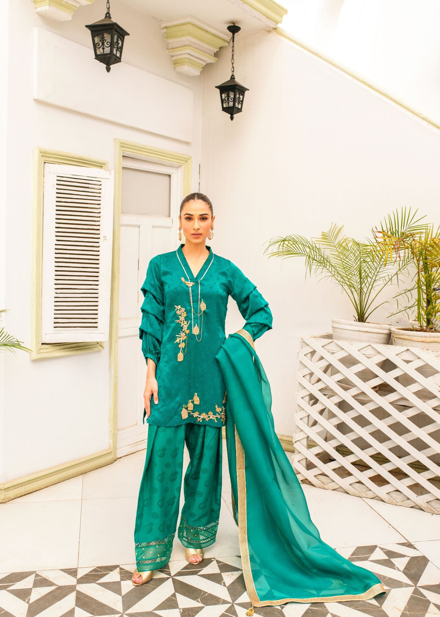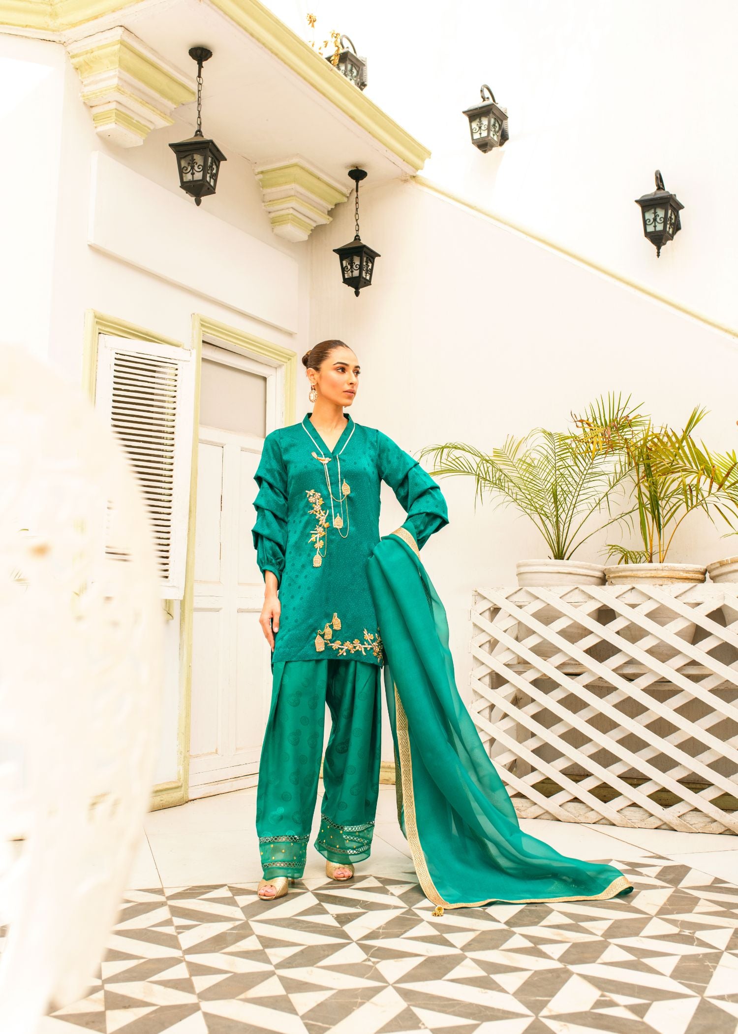 This elegant ensemble features an emerald green kameez with intricate handembroidered bird cage motifs, paired with a classic Punjabi shalwar. A delicate dupatta in sheer organza or luxurious chiffon completes the look, blending traditional craftsmanship with modern grace.