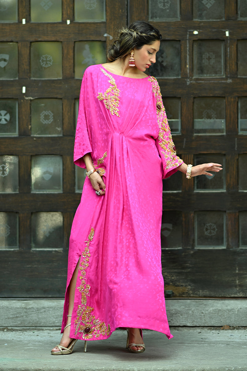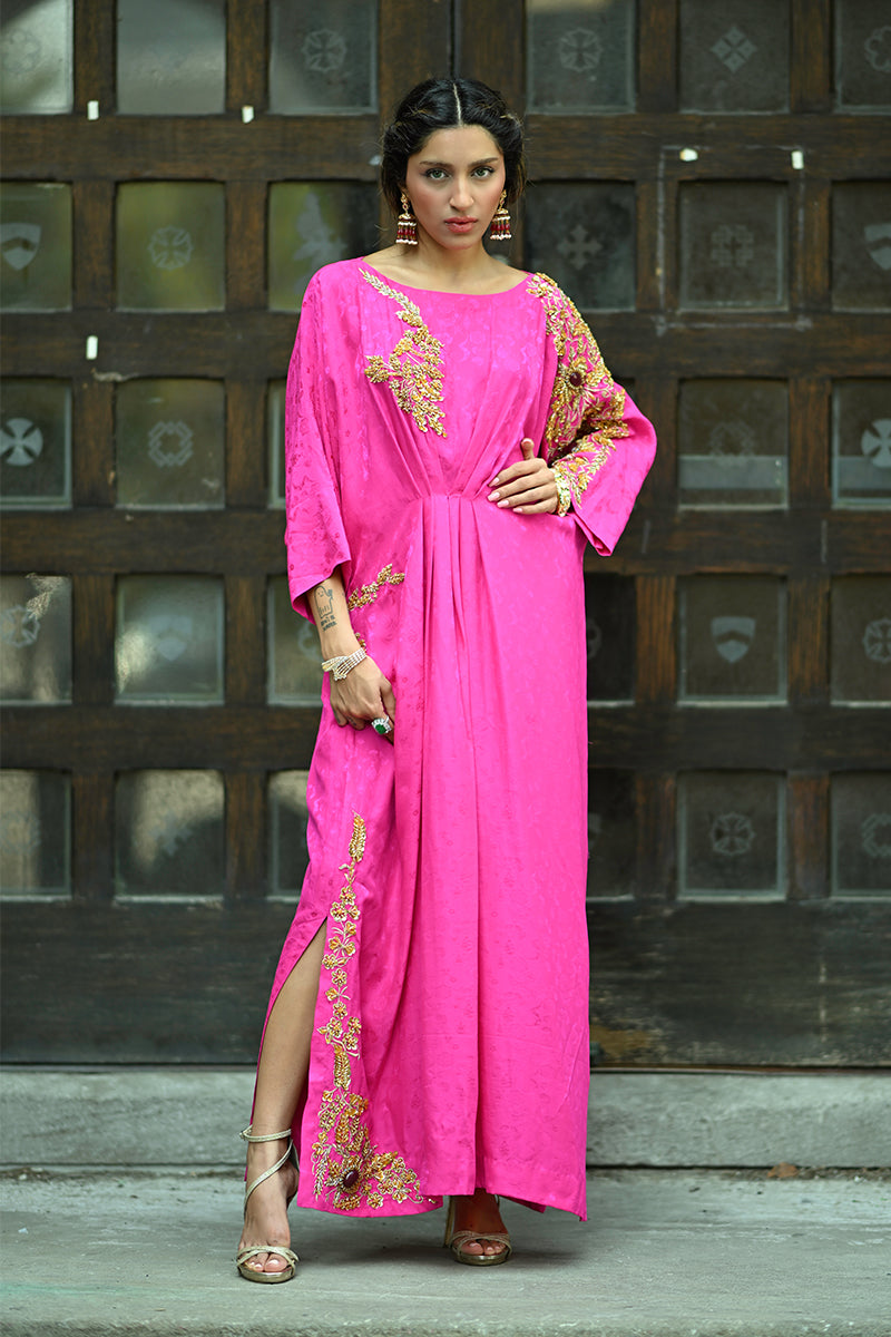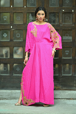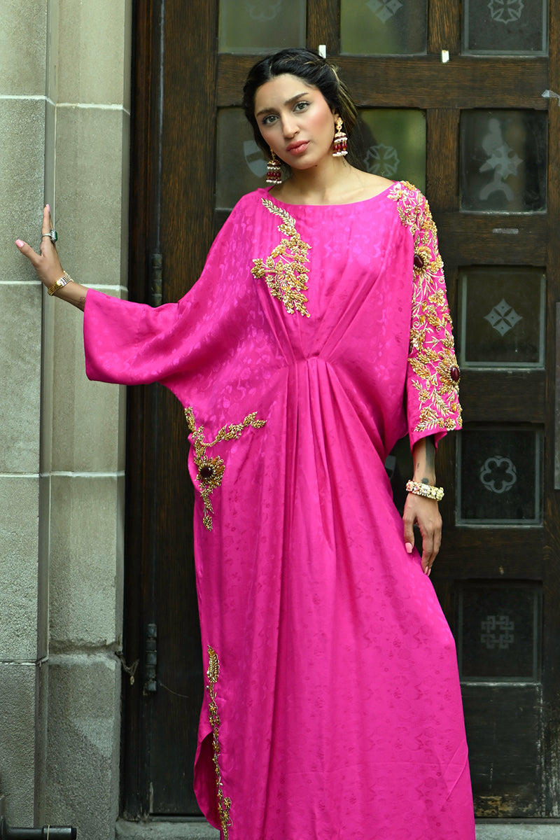 Scarlet Blush is a striking fuchsia kaftan, crafted from pure embossed silk and embellished with intricate gold zari work adorned with ruby-red gemstones. The bold hue is further elevated with delicate gold, gracefully placed along one sleeve. Its relaxed silhouette drapes effortlessly, while subtle gathers at the waist add gentle structure and movement, creating a look of contemporary elegance with timeless allure.