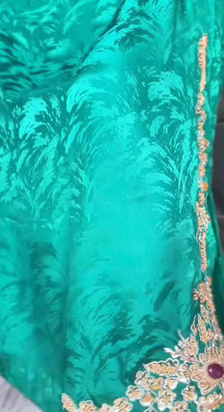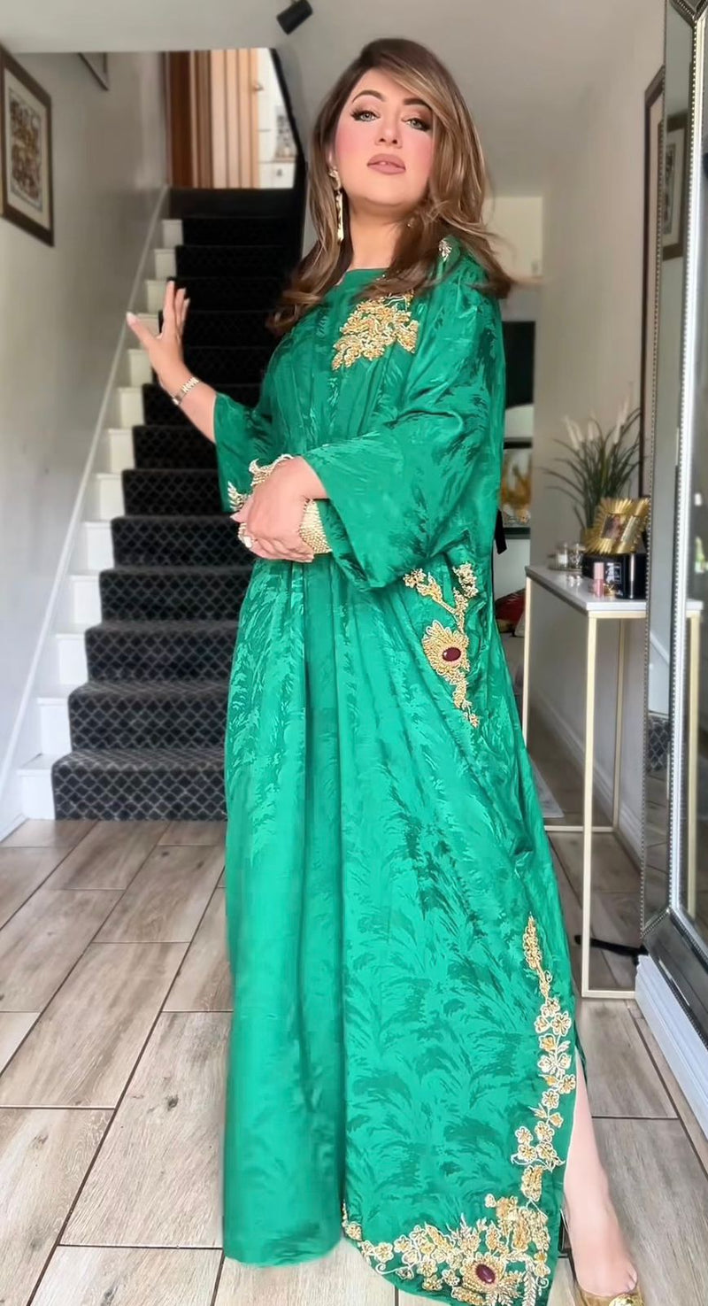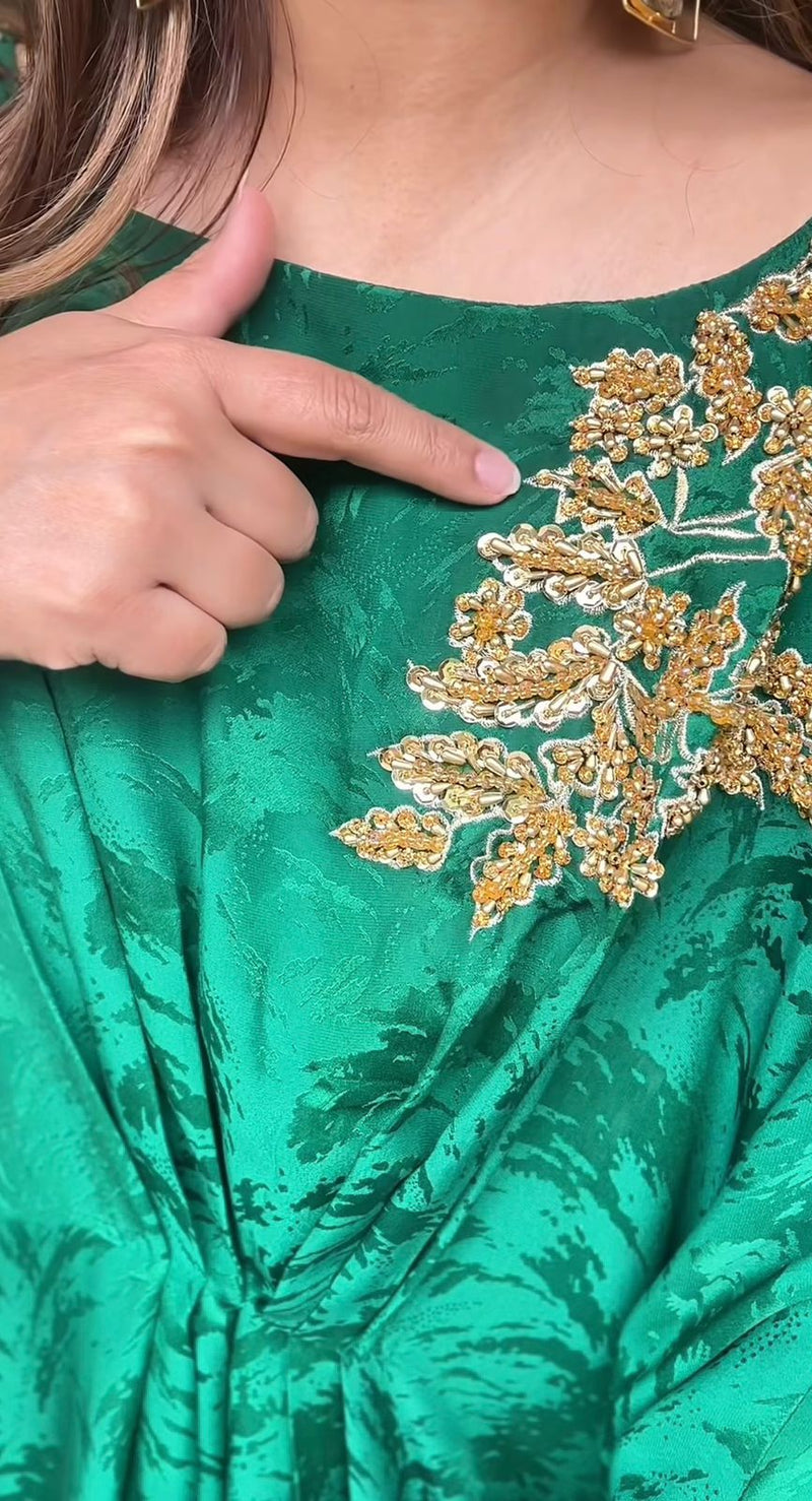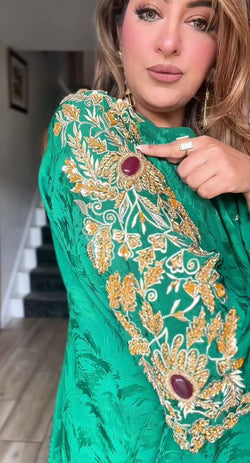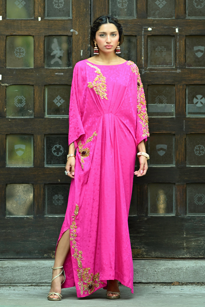 Scarlet Blush is a striking fuchsia kaftan, crafted from pure embossed silk and embellished with intricate gold zari work adorned with ruby-red gemstones. The bold hue is further elevated with delicate gold, gracefully placed along one sleeve. Its relaxed silhouette drapes effortlessly, while subtle gathers at the waist add gentle structure and movement, creating a look of contemporary elegance with timeless allure.