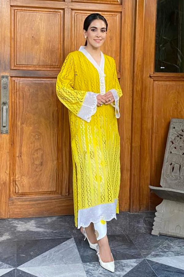 Cutworked Chikan Kari cotton lawn ombré yellow shirt with half-lined till waist on the lawn. Paired with cotton khari shalwar with front belt and back elasticated with lace on the border.