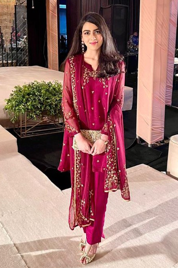 Chiffon kurta with fine detailed Gota work on shirt and dupatta paired with raw silk straight pants.