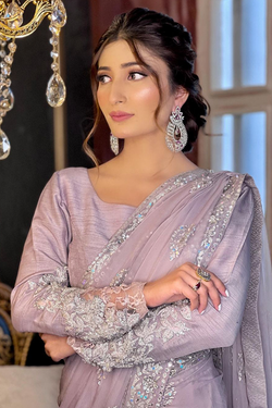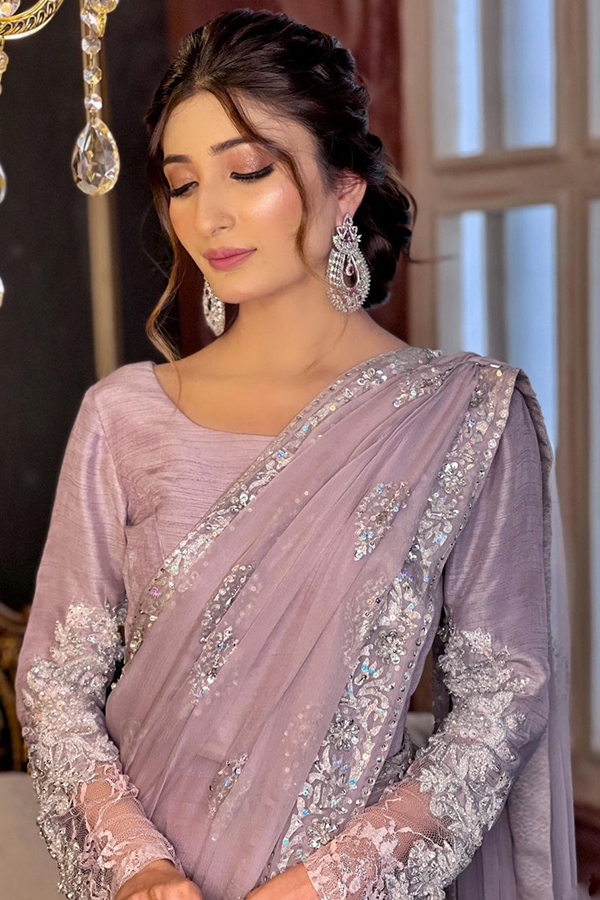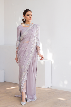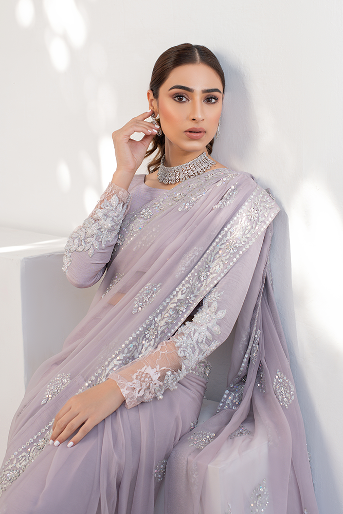 This searing mauve saree pants ensemble is crafted from the purest Chiffon. The illustrious of Saree are adorned with beautiful hand embellishments of Sequins beadwork using the finest zari lace. Finishing the look, paper raw silk pants with gorgeous ornaments are paired making this outfit the perfect choice for any event!