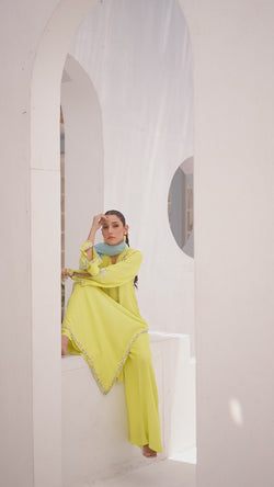 This elegant ensemble features a finely tailored shirt adorned with intricate embellishments. The neckline is gracefully decorated with delicate sequin and beadwork, adding a subtle shimmer that catches the light beautifully. The sides and hemline of the shirt are similarly embellished, enhancing the silhouette with an opulent yet refined touch. The sleeves, extending to full length, are also finished with matching bead and sequin detailing, lending cohesion and balance to the overall design. The shirt is paired with long, flowy ajar pants, which offer a sense of grace and movement. To complete the look, the outfit includes a stunning double-tone dupatta in shades of orange and turquoise. The vibrant contrast between the warm and cool tones creates a visual harmony that ties the ensemble together. The dupatta may be crafted in a lightweight, sheer fabric like chiffon or organza, allowing the colors to blend softly and enhancing the dress's feminine charm.