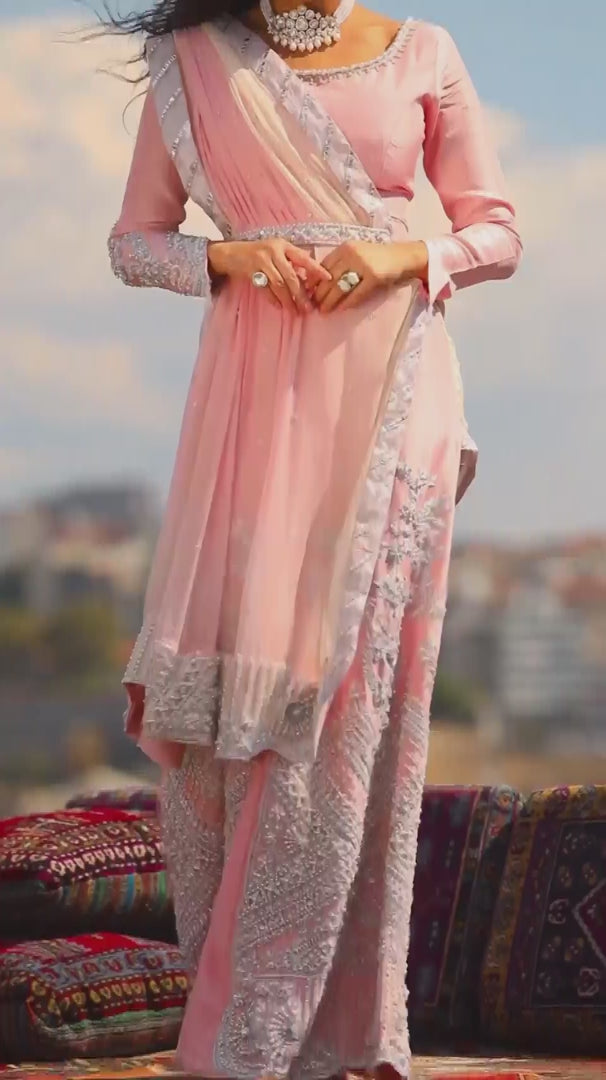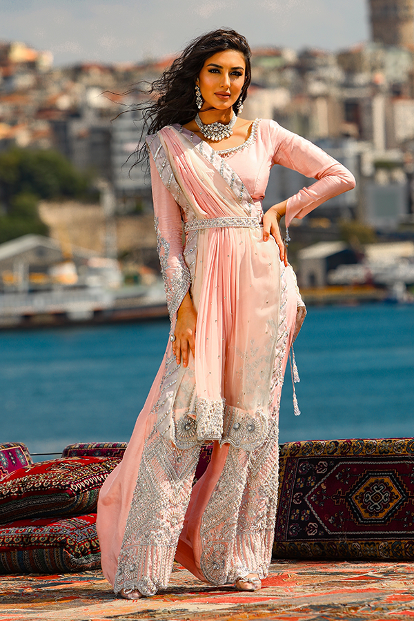 Tatlim is a dreamy peach ombré chiffon saree paired with fully embellished raw silk sharara pants. The meticulous details using silver beads, sequence, tilla, and pearls over the sleeves, blouse, and belt showcase a perfect pastel festive outlook.