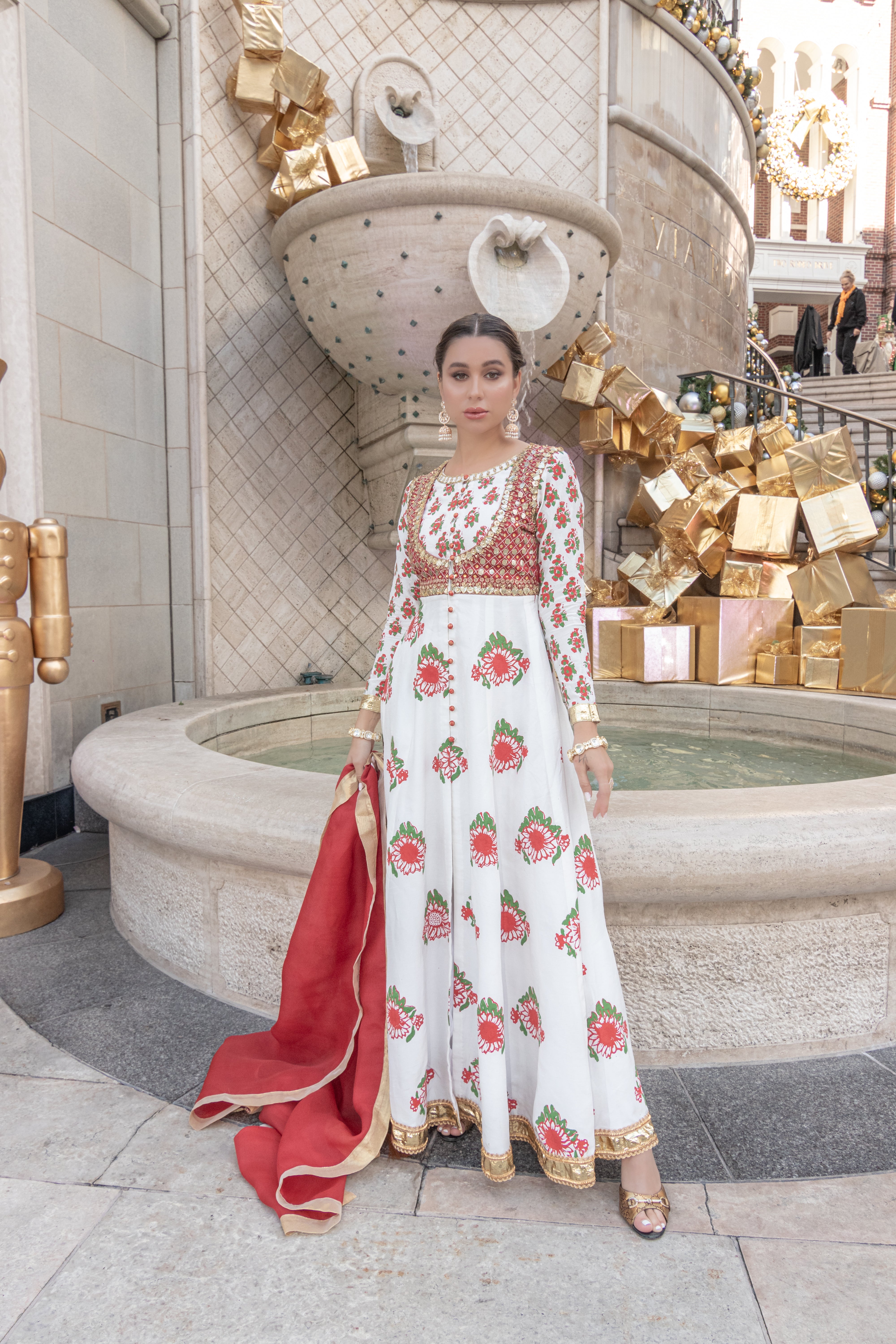Blossom in grace with this front-open floral block printed Anarkali dress. The Gota Patti hand-embellished bodice exudes regal charm, harmonizing perfectly with the cotton grip block printed quellots. Complete the look with the ethereal touch of an organza dupatta.