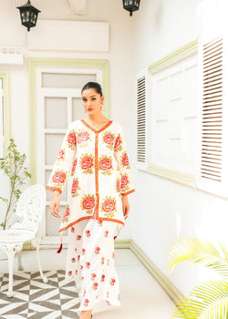 This stylish ensemble features a silk block-printed cord set, paired with a traditional Dhaka shalwar. The hand-block-printed design showcases exquisite craftsmanship, making this outfit a perfect blend of elegance and cultural heritage.