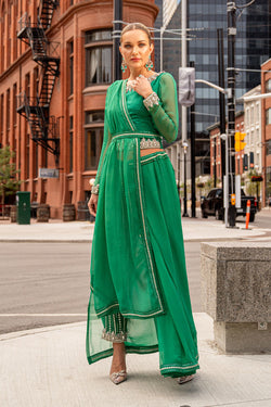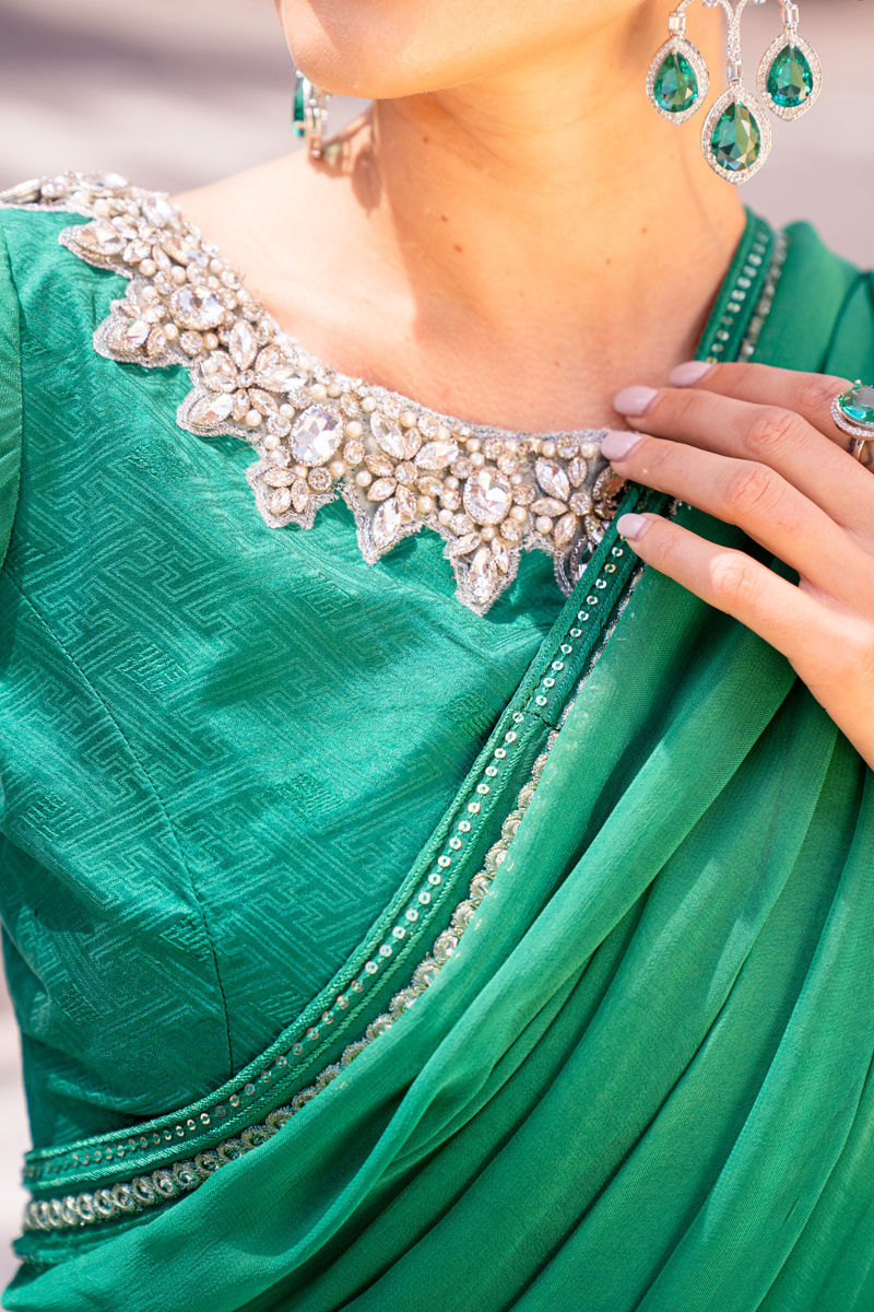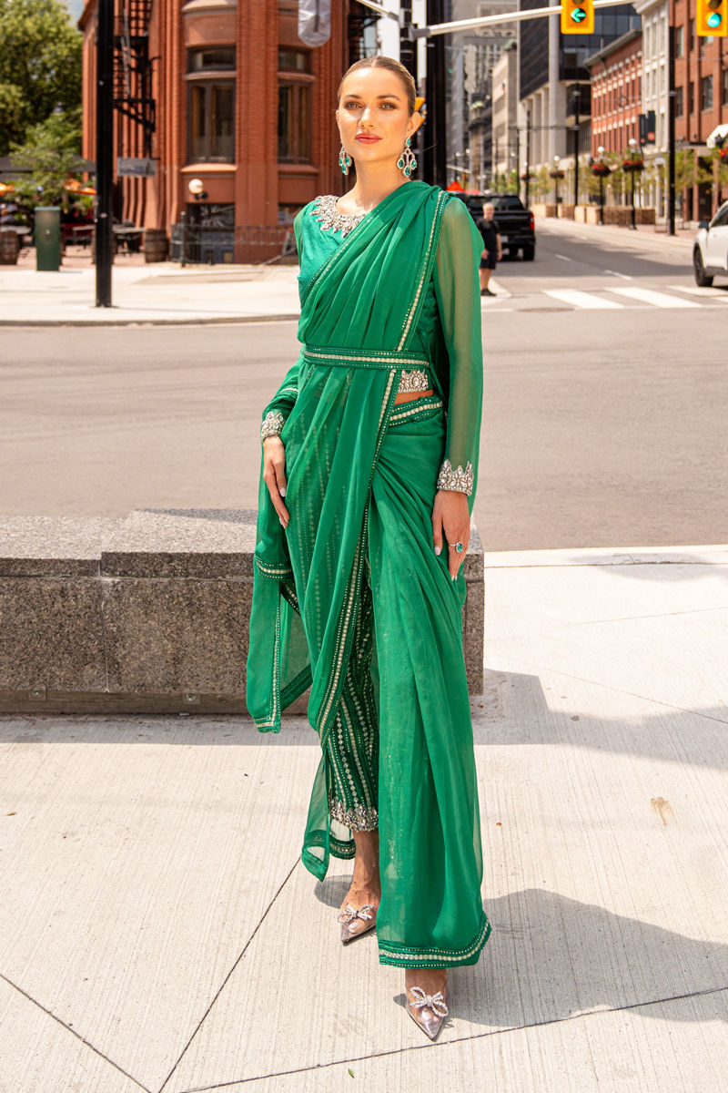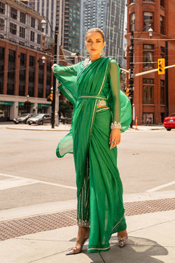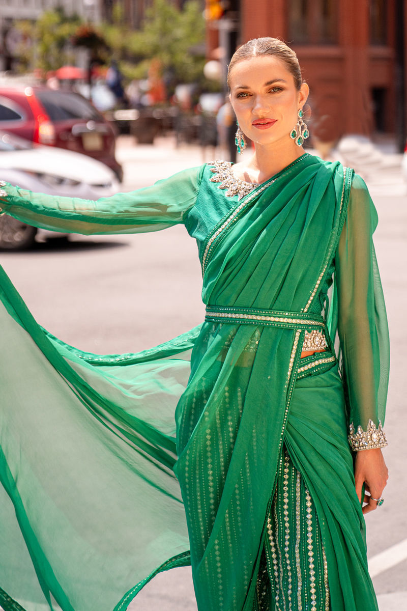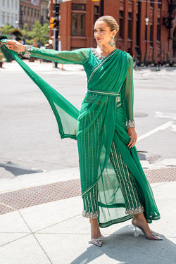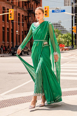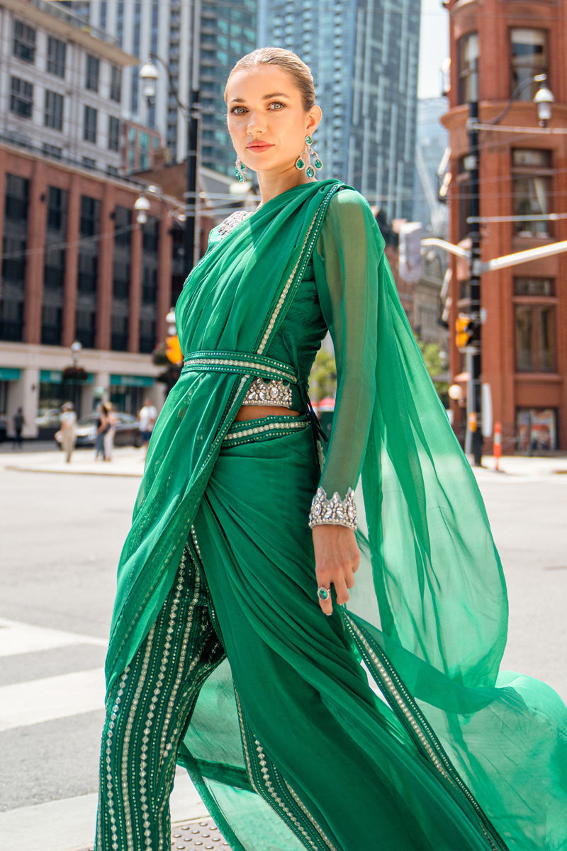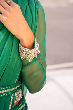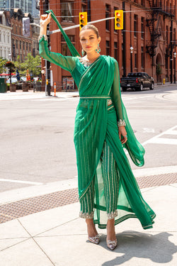 Step into a world of sheer magnificence with our signature saree pants. The stoke worked neckline and sleeves exude timeless charm, while the pants' bottom features intricate borders adorned with panni and mirror work, beautifully mirroring the saree's border and fall. Paired with a side-knotted belt for a perfect waistline fit, this ensemble promises an enchanting experience. The blouse, made of embossed silk with chiffon sleeves, adds a touch of luxury, and the saree drape in pure chiffon completes this regal attire, perfect for grand occasions and celebrations.