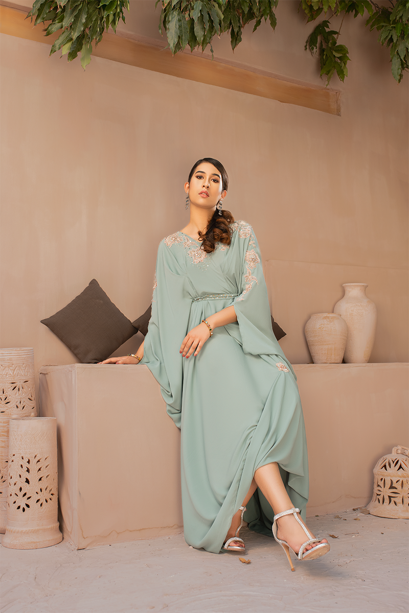 Descriptions: Full length flared kaftan embellished with Reshamwork, beads and stones on neck and sleeves with belt