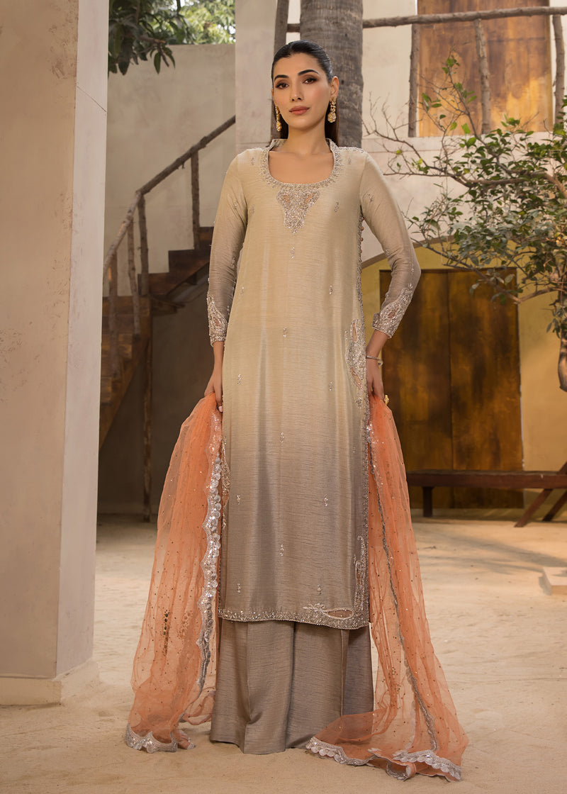 Full Length Ombre Grey hand embelished shirt with ajar pants and orange mukesh dupatta.